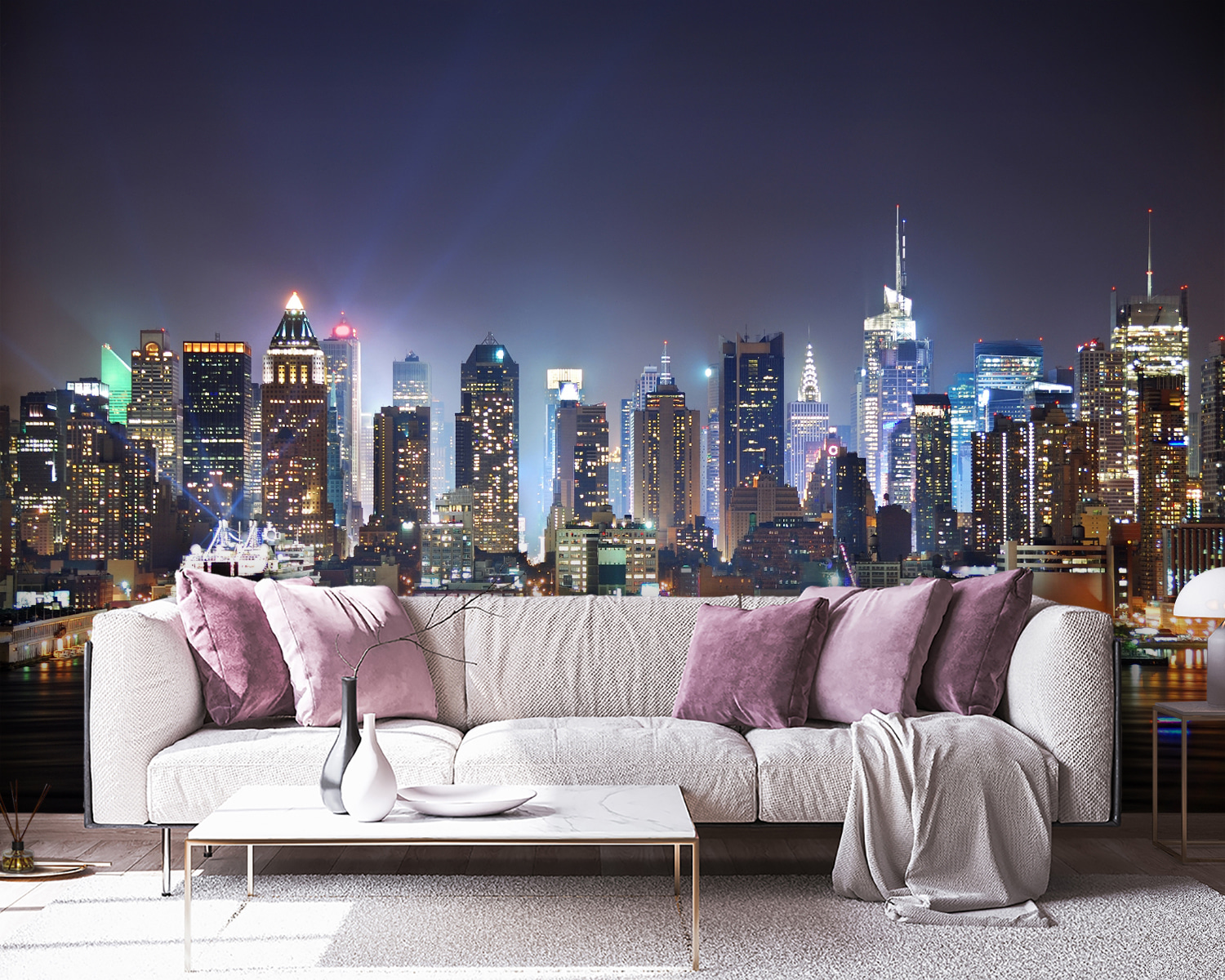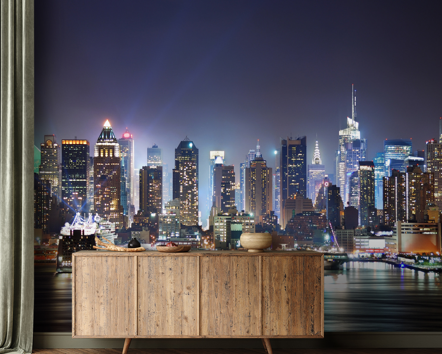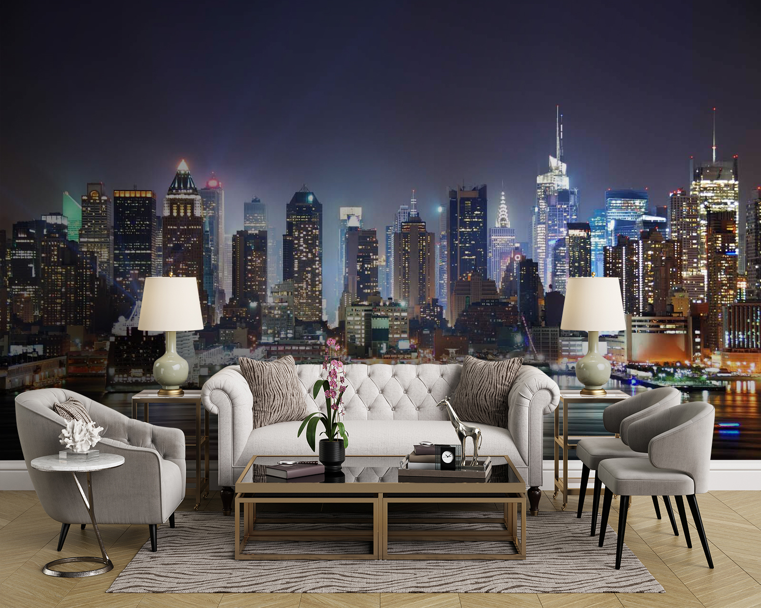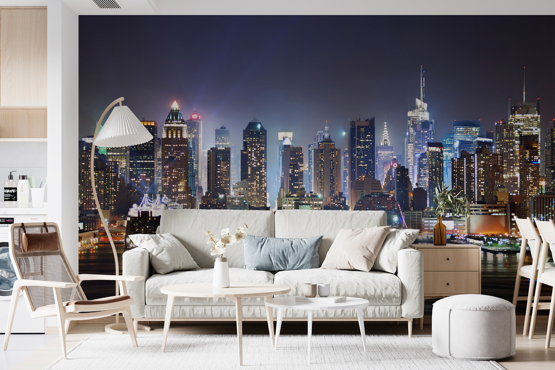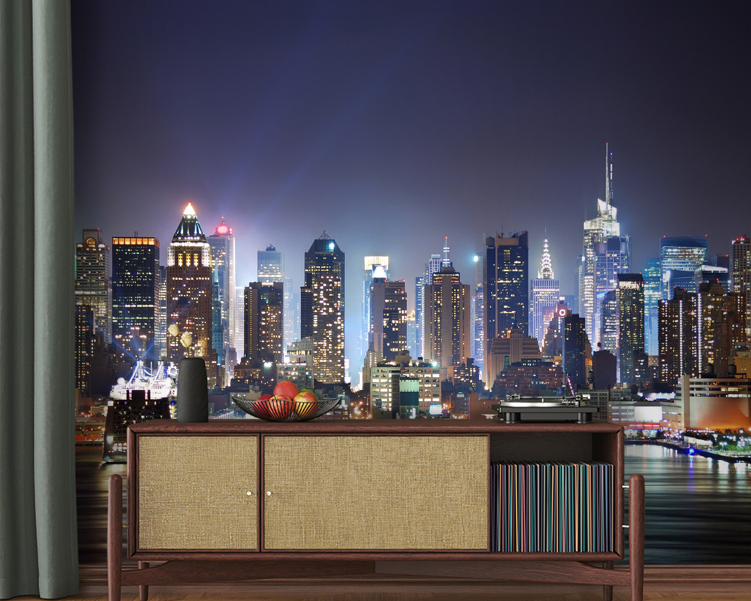 Transform any space with the stunning Wall Mural of a city skyline at night. Imagine having the hustle and bustle of urban life right on your wall, creating a vibrant backdrop that sparks conversation. The rich blues and flickering lights bring an energy that almost makes you feel you’re in the heart of the city, perhaps waiting for a late-night slice or just enjoying the view from a rooftop bar. It’s like a cozy window to the world outside, perfect for anyone dreaming of city adventures. This mural adds a touch of magic to your room, creating a perfect ambiance for gathering, dreaming, or just kicking back. Who needs to visit the city when it can come to you?