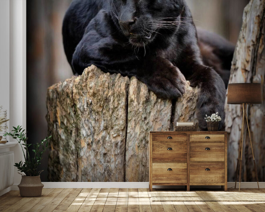 Bring a touch of the wild indoors with the “Black Panther Lying on a Tree Stump” mural. This striking piece captures a moment of pure elegance, where a sleek black panther lounges like it owns the place—because, let’s be honest, it probably thinks it does. Imagine the atmosphere it’ll create in your space, like you’ve got your own little piece of the jungle right at home. Friends will stroll in, do a double-take, and suddenly feel like they’ve entered an exclusive wildlife sanctuary. Perfect for a cozy reading nook or a daring living room—it’s an easy conversation starter. Plus, who wouldn’t want a bold feline friend overseeing their daily shenanigans? Just be prepared to share the spotlight!