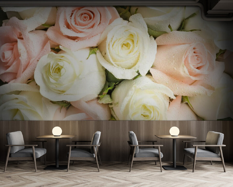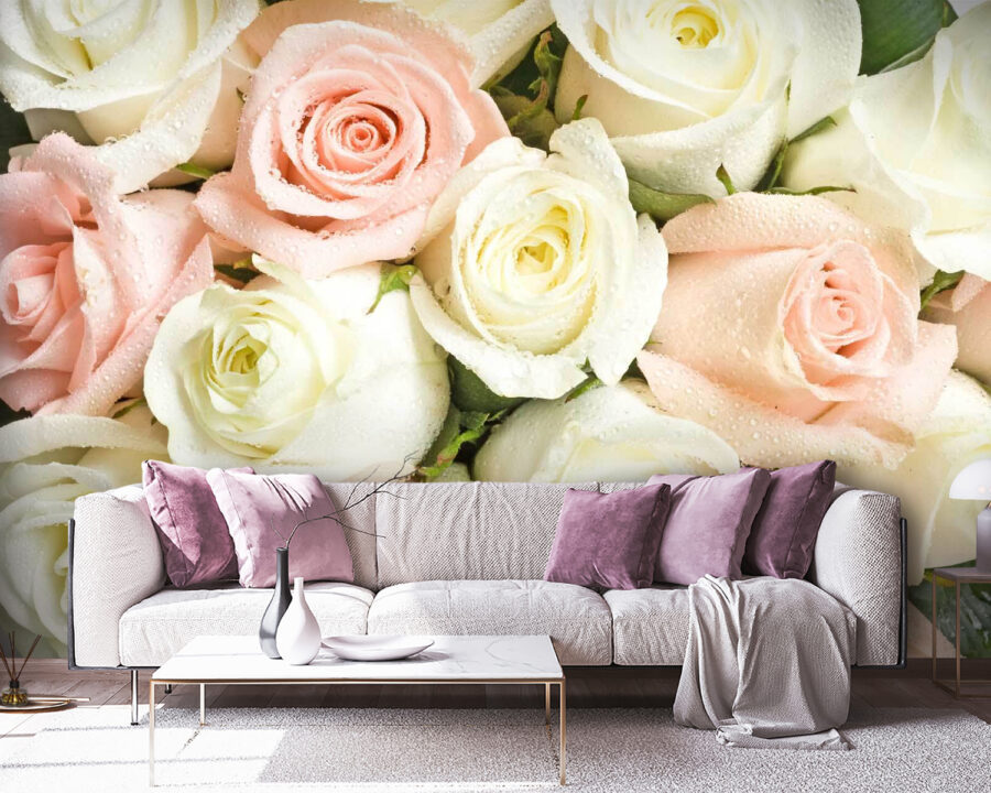 Transform your space with this stunning wall mural featuring a delightful mix of pink and white roses. Imagine walking into a room and being greeted by a burst of floral charm that feels like a garden party—without the need for watering cans! The soft hues whisper relaxation, while those lovely raindrops on the petals bring a refreshing touch. Perfect for a cozy reading nook or a lively living room, it’s like having nature’s beauty at your fingertips. Who wouldn’t smile glancing at such a cheerful sight? Time to bring the outside in and let those roses work their magic!