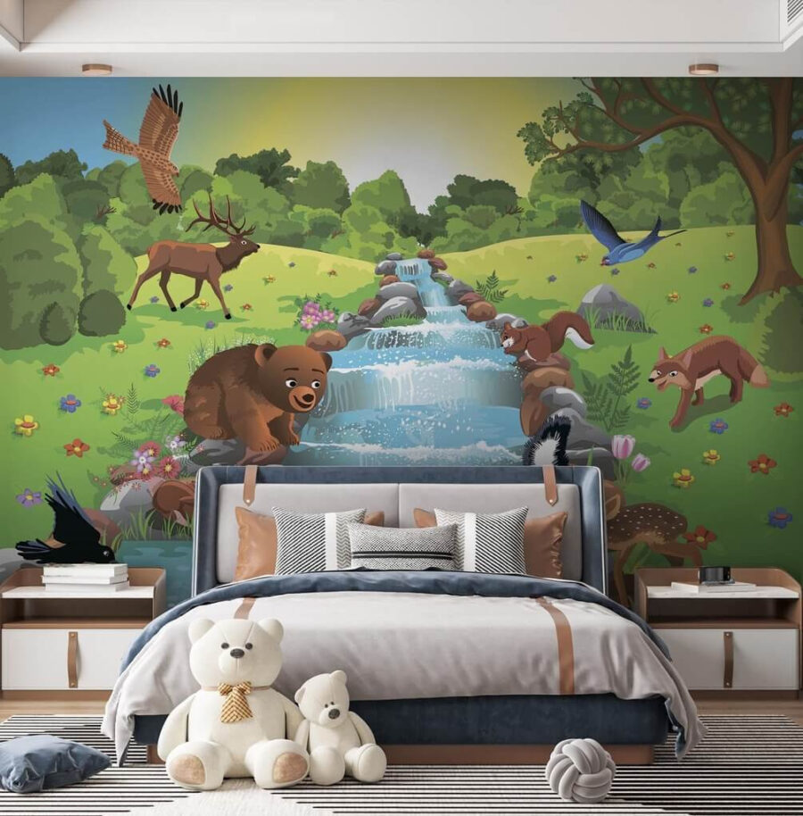 Transform your space into a lively woodland with this charming wall mural featuring quirky animal friends enjoying a sunny day by a sparkling stream. Imagine a bear splashing in the water, a curious deer bending down for a drink, and a cheeky squirrel plotting its next snack. This mural brings a sense of joy and warmth, perfect for family rooms or play areas—it’s like having a mini wildlife adventure right in your home! Every glance will remind you of simpler times, fresh air, and maybe even make you feel like jumping into the great outdoors. Embrace nature’s charm and let your walls tell a story!