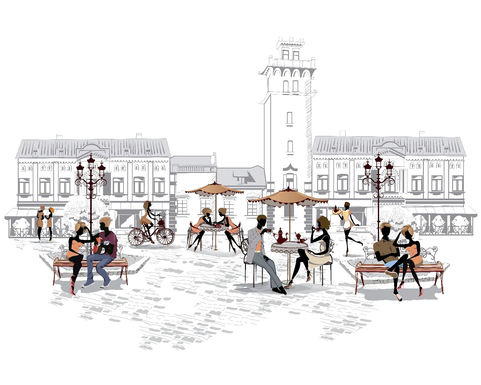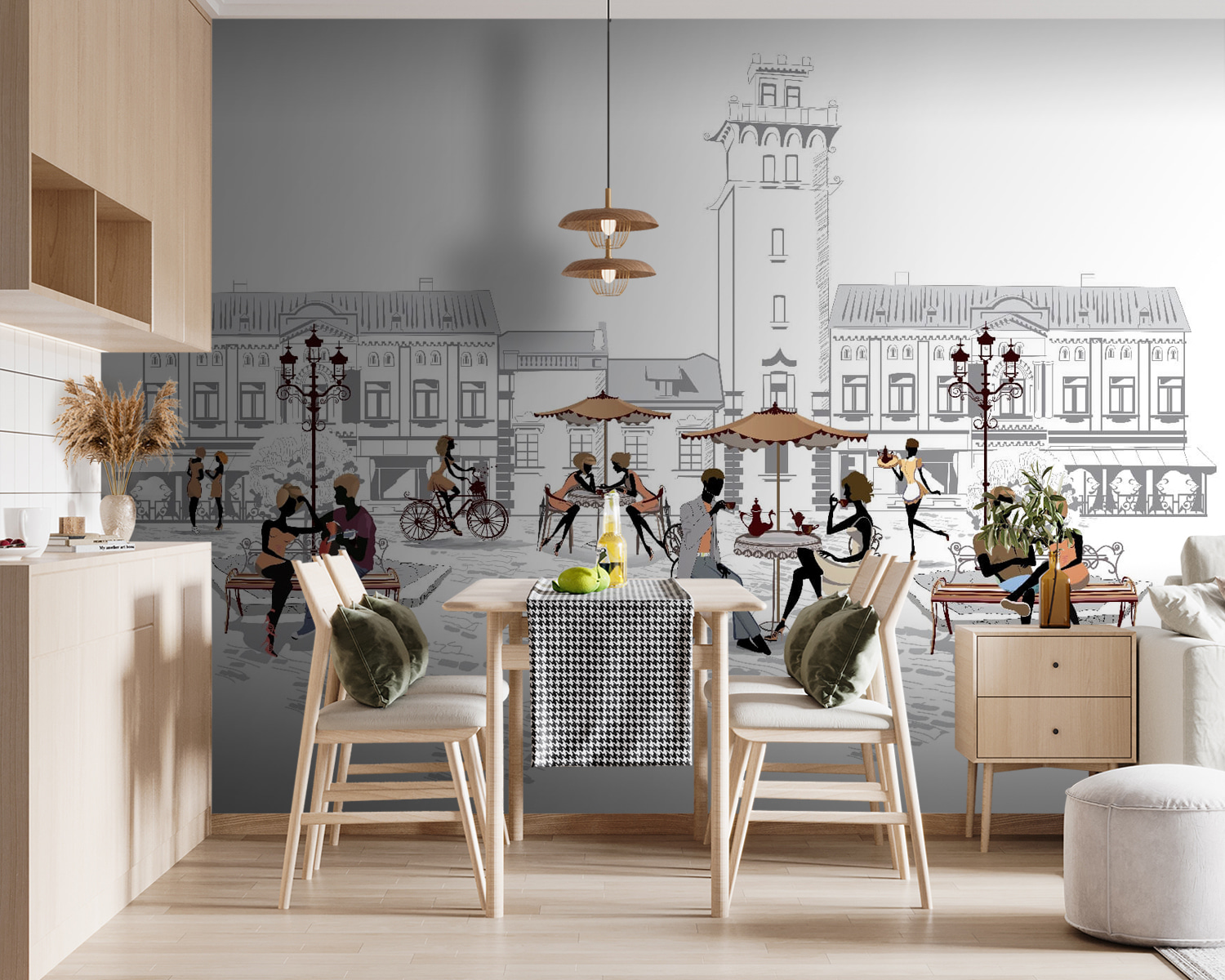 Step into a charming world with this delightful wall mural of a bustling café scene. Picture couples lost in conversation on a bench, folks sipping drinks, and laughter floating through the air. It’s like a slice of life from a dreamy European street, where time seems to slow down. The playful details add a warm touch, making your space feel alive and inviting. Imagine this on your wall—perfect for sparking conversations or simply daydreaming while you sip your morning coffee. It transforms any room into a cozy retreat, where every glance can transport you to a sunlit afternoon.