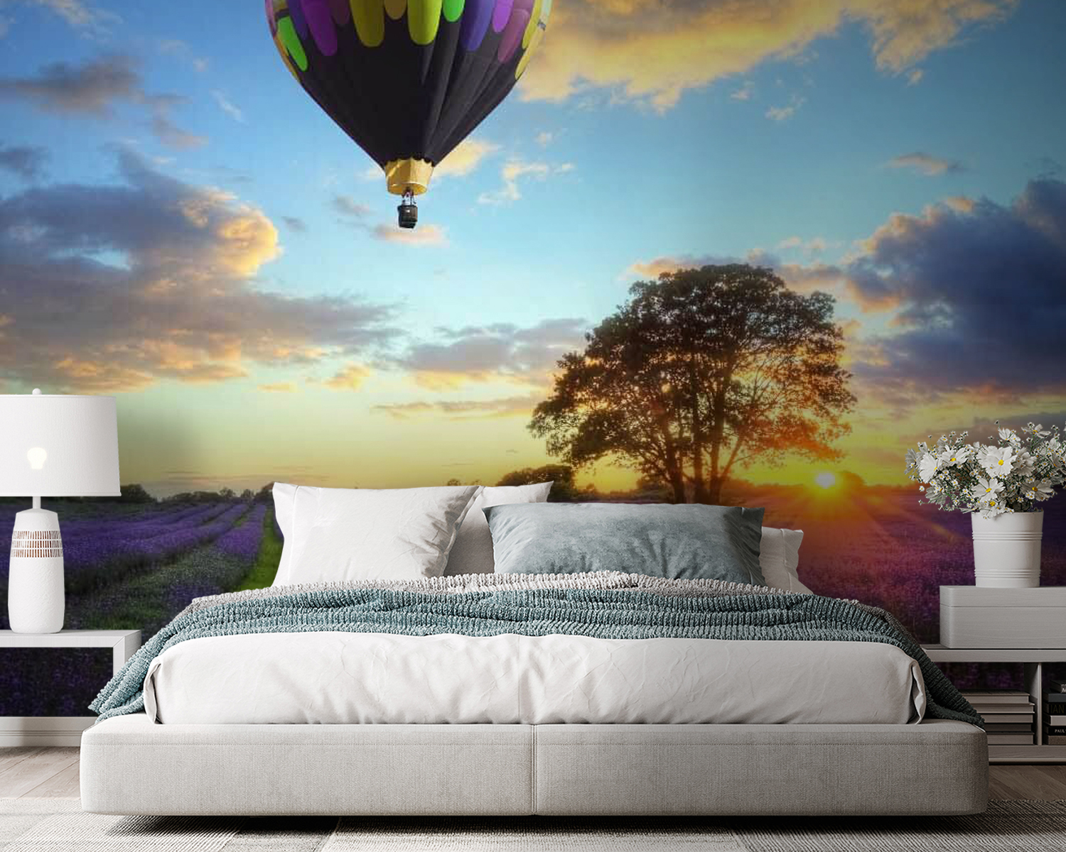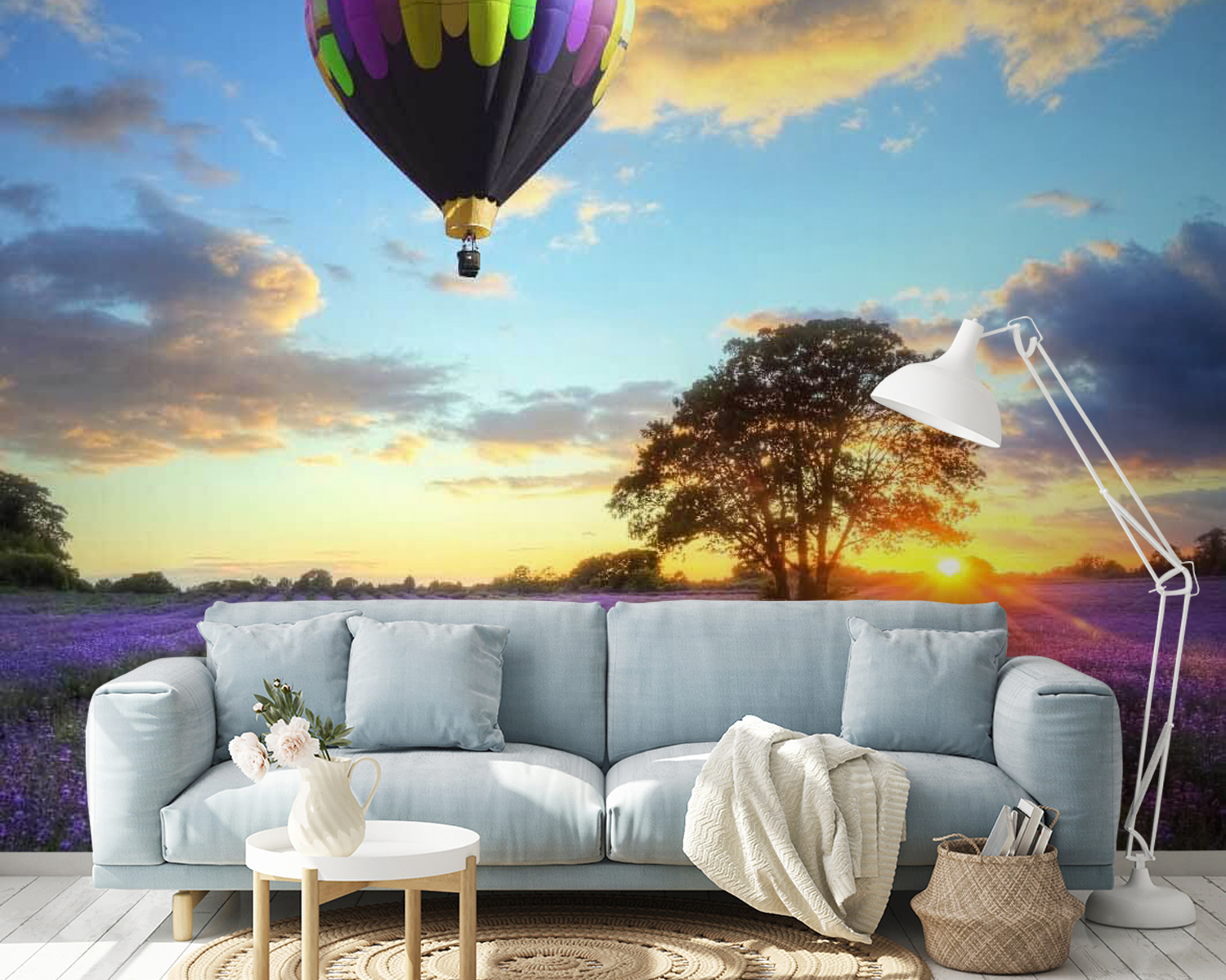 Picture this: a field bursting with vibrant lavender blooms, under a sky painted with the warm hues of sunset. And there, floating gracefully above it all, a group of whimsical hot air balloons, like candy-colored dreams taking flight. This mural doesn’t just decorate—it invites everyone to daydream and escape into a serene world. Imagine walking into your space and feeling a gentle breeze of calm wash over you, as if you’ve stepped into your own peaceful retreat. It’s like having a mini-vacation right on your wall! Perfect for any room needing a dose of cheer, it whispers soft tales of adventure and the beauty of nature. Ideal for those who love flowers, sky gazing, or just a bit of magic in everyday life. Who wouldn’t want to drift away on a colorful balloon ride over a sea of lavender?