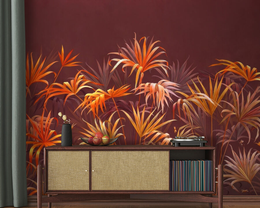Transform your space with the “Vibrant Foliage Against Brown Backdrop” mural—it’s like bringing a slice of the tropics right into your home. Picture this: a cozy evening, soft lighting, and you lounging on the couch, all while vibrant leaves dance across the wall. The warm hues of orange and soft brown create an inviting aura, perfect for those mid-afternoon coffee breaks or lazy weekend vibes. And guess what? No watering required! It’s a low-maintenance way to enjoy nature’s beauty. Just imagine how your friends will rave over this unique touch. It’s not just a mural; it’s like having a chatty plant friend that never needs sun. Perfect for spicing up that empty wall, making it a real conversation starter. A little piece of paradise, right at home.