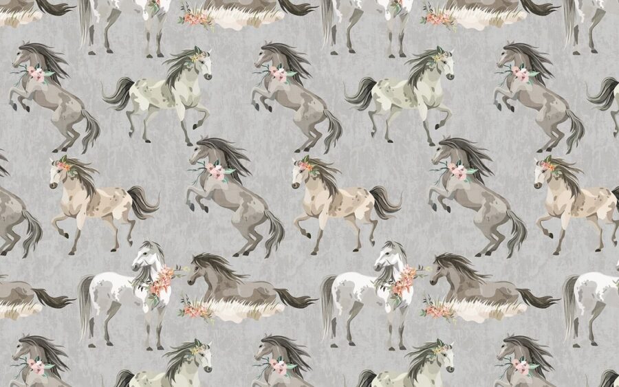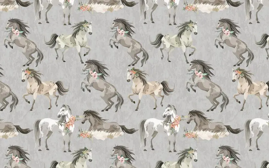 Imagine brightening up a room with a splash of charm—this “Horse with Flowers in Its Hair” mural does just that! It’s not just wall decor; it’s like inviting a bunch of cheerful stallions to a grazing party in your home. Each horse prances and plays, adorned with delicate blooms that add a hint of whimsy. Picture it in a kid’s room, where it sparks daydreams of galloping adventures, or maybe in a cozy corner, creating a tranquil retreat. You’ll find yourself smiling every time you catch a glimpse. So, why not let these beautiful beasts bring a little joy to those four walls? A mural like this is bound to inspire some delightful stories!