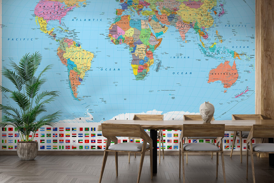 Transform your space into a globe-trotter’s paradise with this vibrant wall mural of the world, complete with a medley of flags. Picture it—friends swinging by for coffee, and everyone’s eyes drift over this colorful map, sparking stories and travel dreams. It’s not just a mural; it’s an invitation to explore the globe while sipping your favorite brew. The bright hues breathe life into any room, be it a cozy nook or an expansive living area. Just imagine setting the scene for fun debates about the best pizza in Italy versus the tacos of Mexico. Who wouldn’t want to gather around this stunning focal point? It’s not just decor; it’s a conversation starter. Go on, let the adventure begin right on your wall!