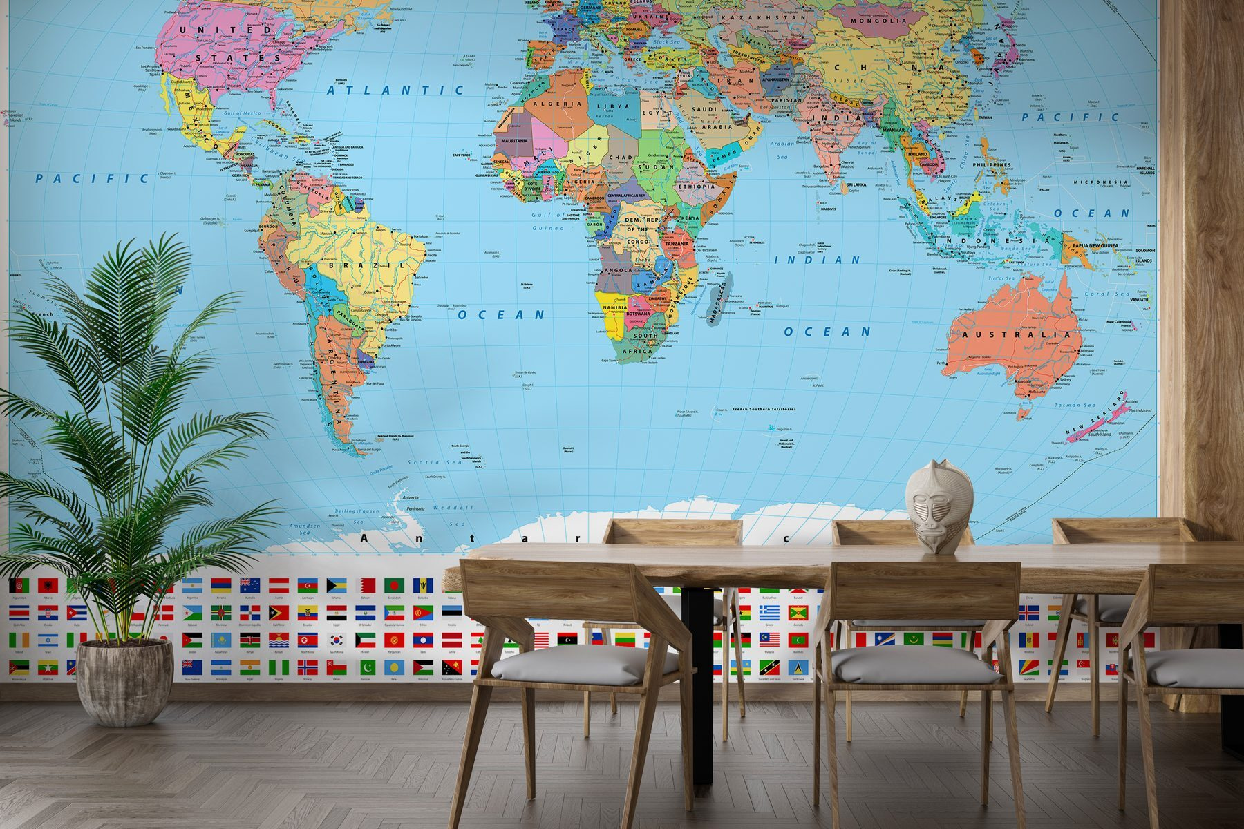 Transform your space into a globe-trotter’s paradise with this vibrant wall mural of the world, complete with a medley of flags. Picture it—friends swinging by for coffee, and everyone’s eyes drift over this colorful map, sparking stories and travel dreams. It’s not just a mural; it’s an invitation to explore the globe while sipping your favorite brew. The bright hues breathe life into any room, be it a cozy nook or an expansive living area. Just imagine setting the scene for fun debates about the best pizza in Italy versus the tacos of Mexico. Who wouldn’t want to gather around this stunning focal point? It’s not just decor; it’s a conversation starter. Go on, let the adventure begin right on your wall!
