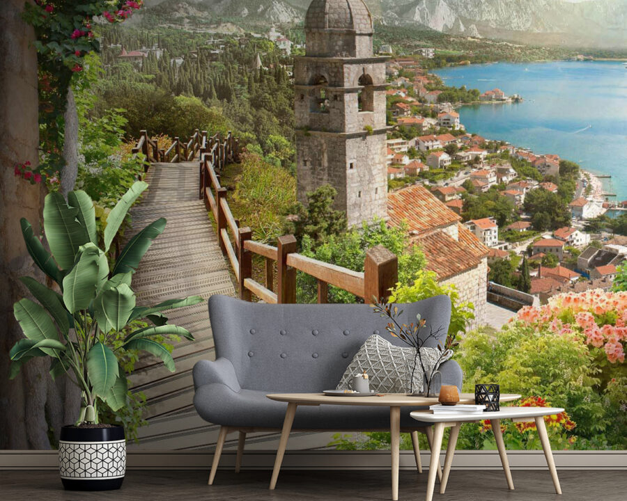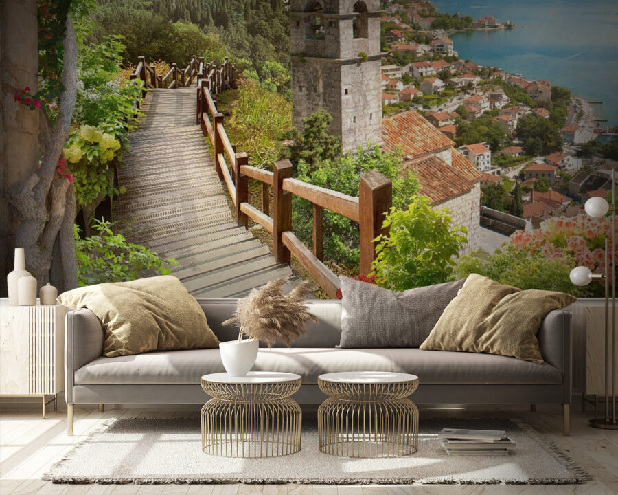 Imagine stepping into a dreamy escape every time you glance at your wall. This “Stairway Leading to a Town” mural whispers tales of sunlit strolls through vibrant gardens, with flowers just begging to be admired. The soft wooden path leads you through a charming village, where cobblestone streets and colorful rooftops gently tug at your imagination. Maybe you can almost hear the laughter of children or the distant sound of waves lapping at the shore. It’s a slice of paradise right in your home. Transform your space with this mural, and let it carry you away, even if just for a moment—it’s the perfect conversation starter for those lazy Sundays with friends. Suitable for all nature lovers and daydreamers, this piece adds warmth and life to any room.