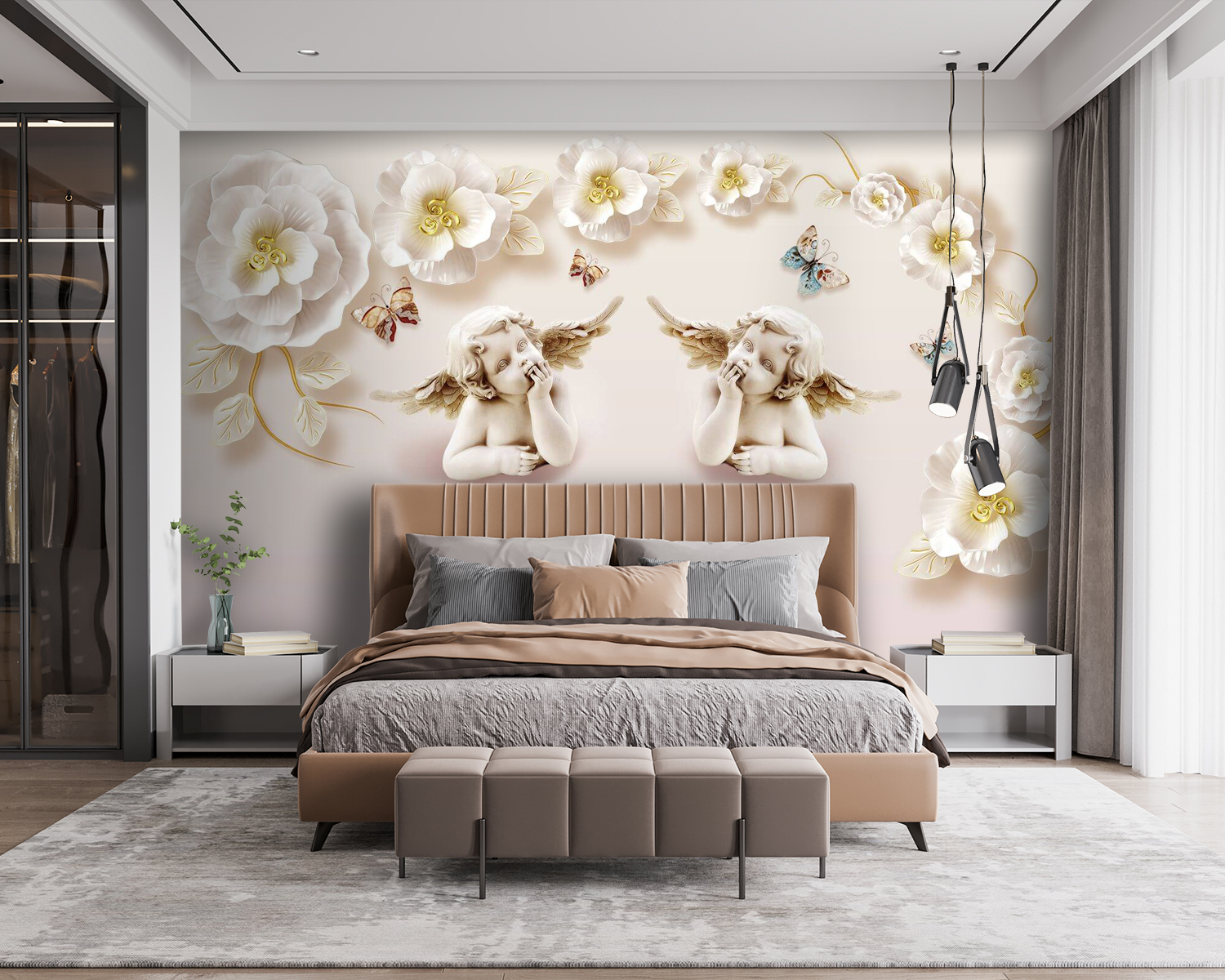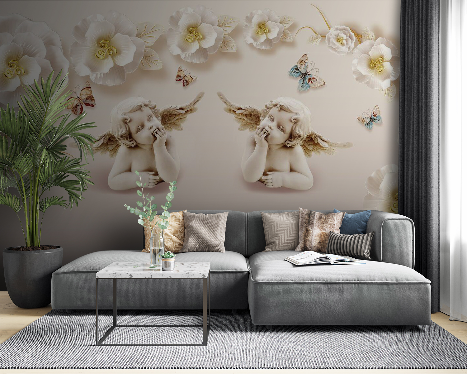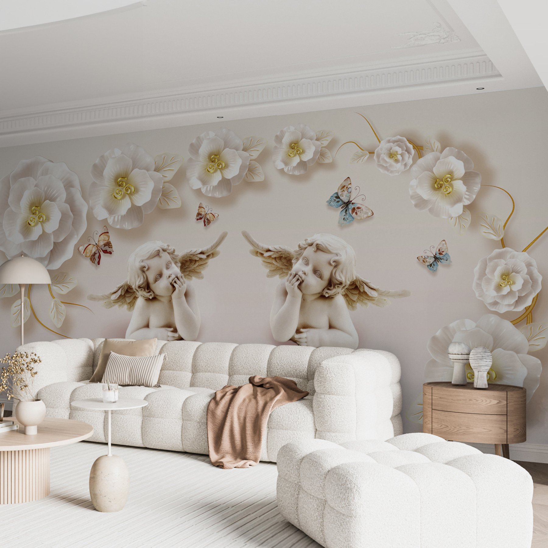 Transform your space with this enchanting wall mural featuring angelic babies with wings, surrounded by delicate flowers and fluttering butterflies. It’s like bringing a touch of whimsy and wonder into your home. Imagine walking into a room and feeling instantly uplifted—these little cherubs seem to whisper secrets of joy and innocence. Perfect for a nursery, cozy reading nook, or even a playful accent wall, this mural adds character without overwhelming the space. It’s a gentle reminder to embrace the magic in everyday moments, one charming detail at a time. Plus, who wouldn’t smile at cherubs contemplating life? Just makes you want to join in their daydream!