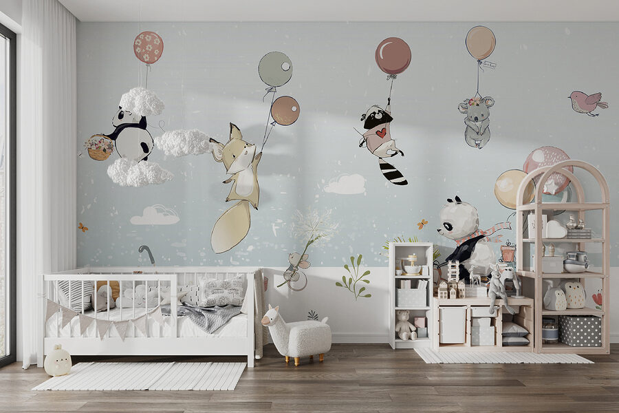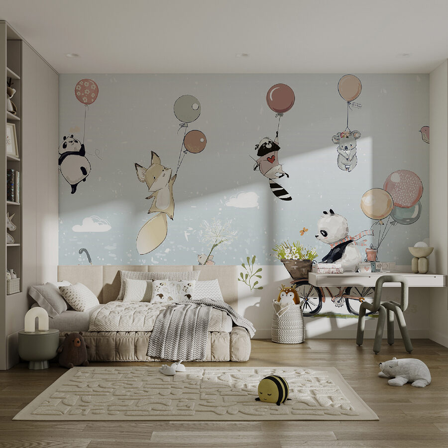Brighten up any little one’s space with this enchanting wall mural featuring a delightful panda joyfully transporting a basket of flowers. Picture this: vibrant balloons floating against a soft, pastel sky, as charming friends like a fox and a raccoon join in the fun. It’s like a cozy adventure right on the wall! The whimsical design will spark imaginations, instantly turning a room into a playful haven. Imagine bedtime stories under the watchful gaze of these adorable animals. It’s not just decor; it’s an invitation to dream bigger! Perfect for daughters’ rooms or any place that could use a sprinkle of joy. Who wouldn’t want to wake up to that?
