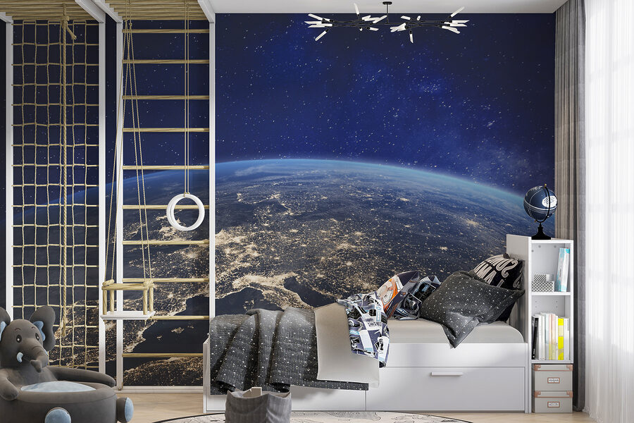 Imagine walking into a room and being greeted by a stunning view of Earth from space—talk about a conversation starter! This “View of Earth from Space” mural doesn’t just cover a wall; it wraps the room in a soft embrace of midnight blues and twinkling lights, making it feel like you’re floating among the stars. It’s perfect for those who dream of distant galaxies or just love a touch of the cosmos in their lives.