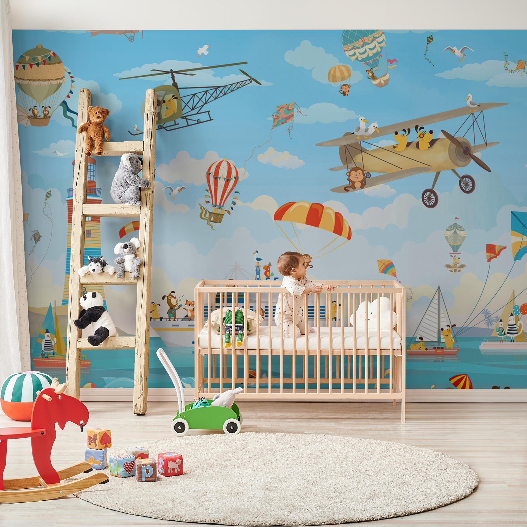 Imagine a whimsical world where monkeys take flight with cheerful abandon! This playful mural, “Monkey Holding a Parachute,” transforms any child’s space into a vibrant adventure playground. Picture the little ones gazing up at these mischievous monkeys soaring high above the sea, sharing the skies with kites, colorful hot air balloons, and even a friendly dolphin leaping about. It’s like a story waiting to unfold every day! This mural sparks imagination and joy—who wouldn’t want to dive into such a lively scene? Perfect for any playroom or nursery, it’s sure to inspire giggles and dreams of daring escapades. No more boring walls, just a splash of fun ready to brighten everyday moments. Let this mural be the backdrop for laughter and creativity!