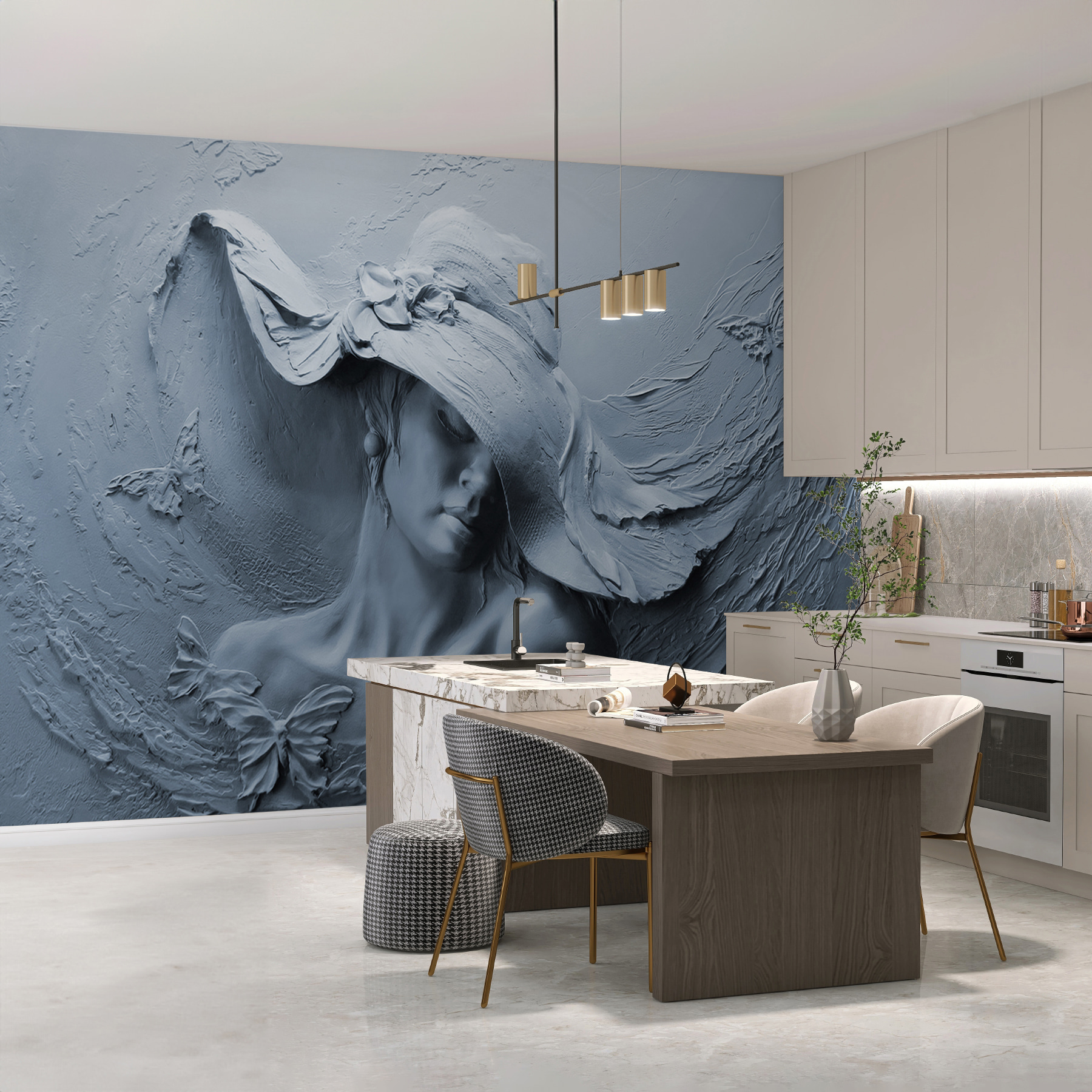 Transform your space with this enchanting wall mural featuring a serene sculpture of a woman in a hat, perfect for those who appreciate unique artistry. Imagine walking into a room where this lovely figure seems to gaze softly at you, whispering secrets of calm and tranquility. The flowing lines and delicate butterflies add a gentle touch, almost like a soft breeze. It’s like having a little piece of art that tells a story, inviting you to pause and reflect. Great for adding depth and character, this mural might just become the favorite conversation starter for your guests. Who knew walls could feel so alive?
