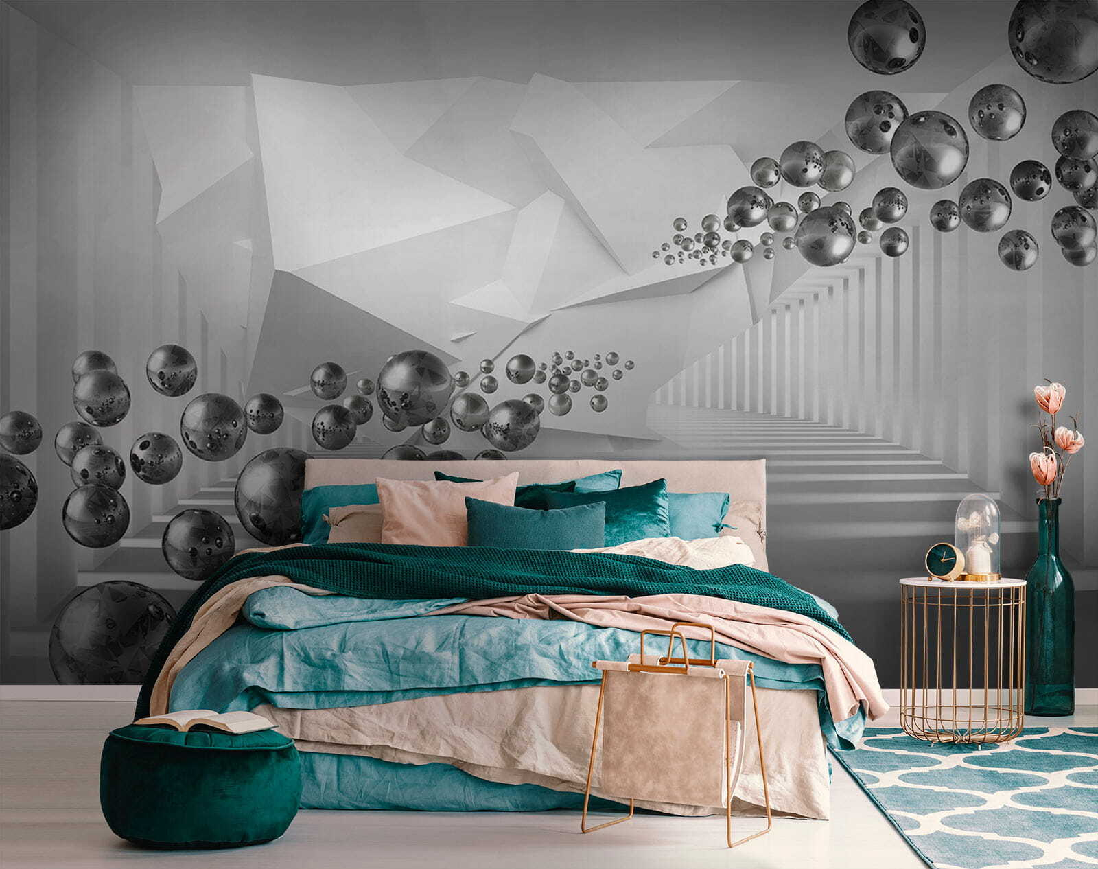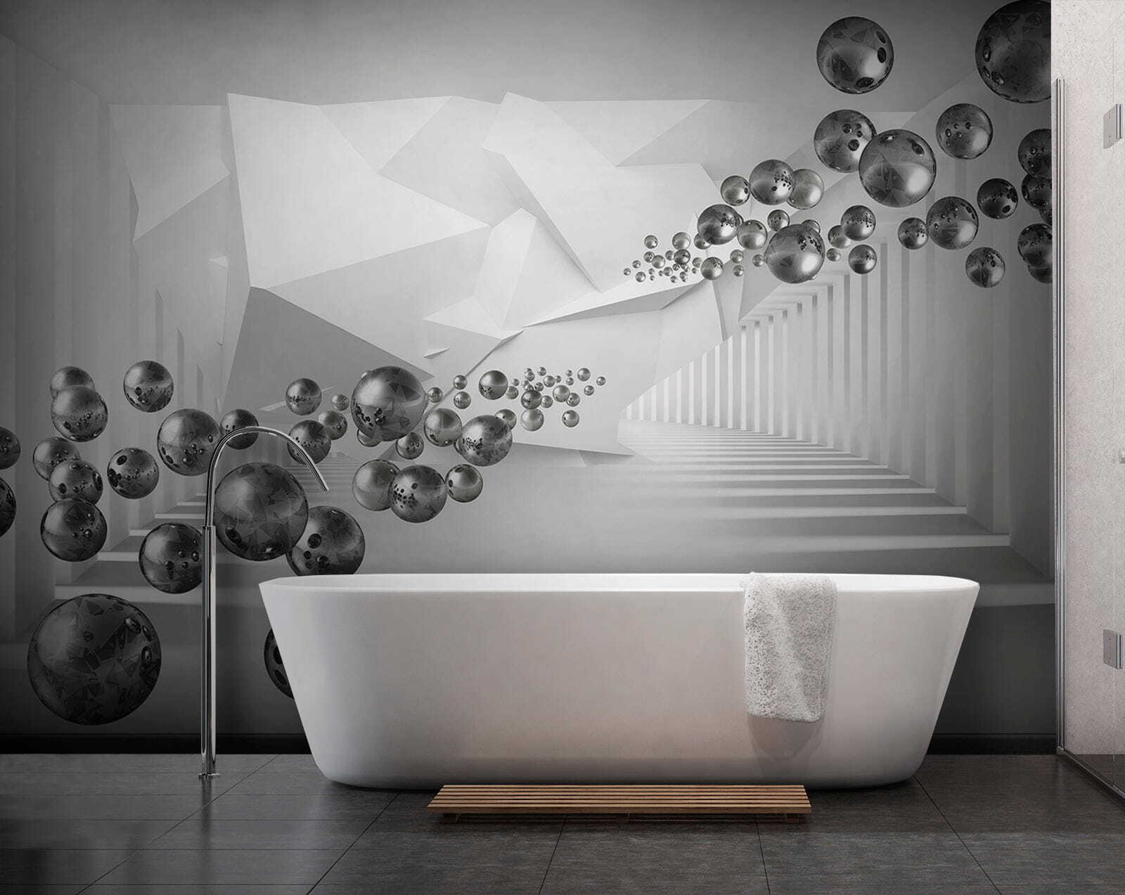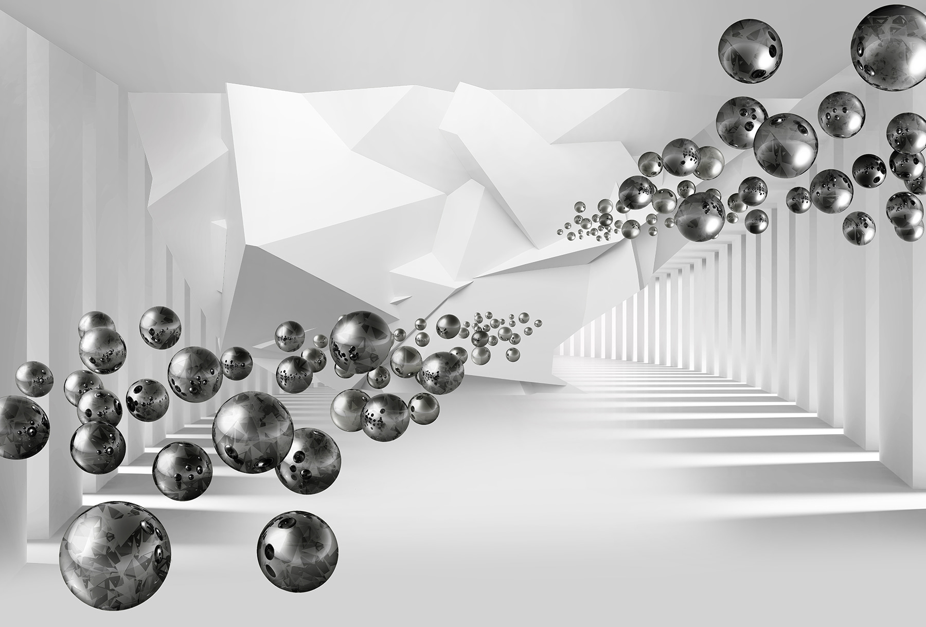 Transform your space with this stunning wall mural featuring floating spheres in a geometric corridor. It’s like stepping into a dreamy alternate universe where shapes dance and shadows play. Picture this—waking up and finding yourself surrounded by this captivating scene, it adds a serene yet intriguing vibe to any room. Friends will wonder, did they just enter an art gallery? It’s a conversation starter for sure. Perfect for creating a stylish backdrop in a living room or a cozy nook. Let imagination take the lead, and watch as this mural breathes life into your walls.
