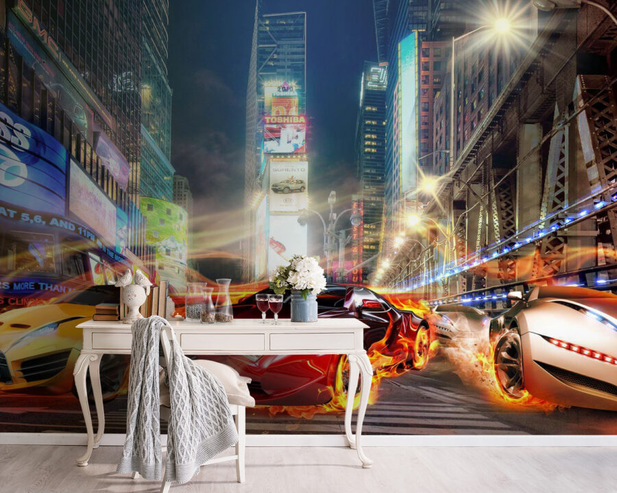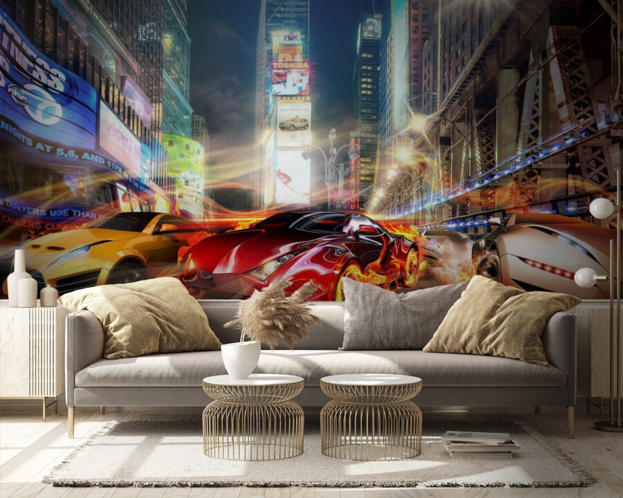 Rev up your space with this electrifying wall mural featuring a red sports car on fire! Imagine stepping into a lively, cinematic street scene every time you walk into the room. This vibrant artwork isn’t just a decoration; it’s an invitation to dream big and speed ahead. Perfect for kids with a flair for adventure or any car enthusiast, it ignites imagination and conversation. Picture a game night with friends, laughter echoing as they marvel at the artwork—how cool is that? Transform any dull wall into a highway of excitement, where every glance is a thrilling ride!