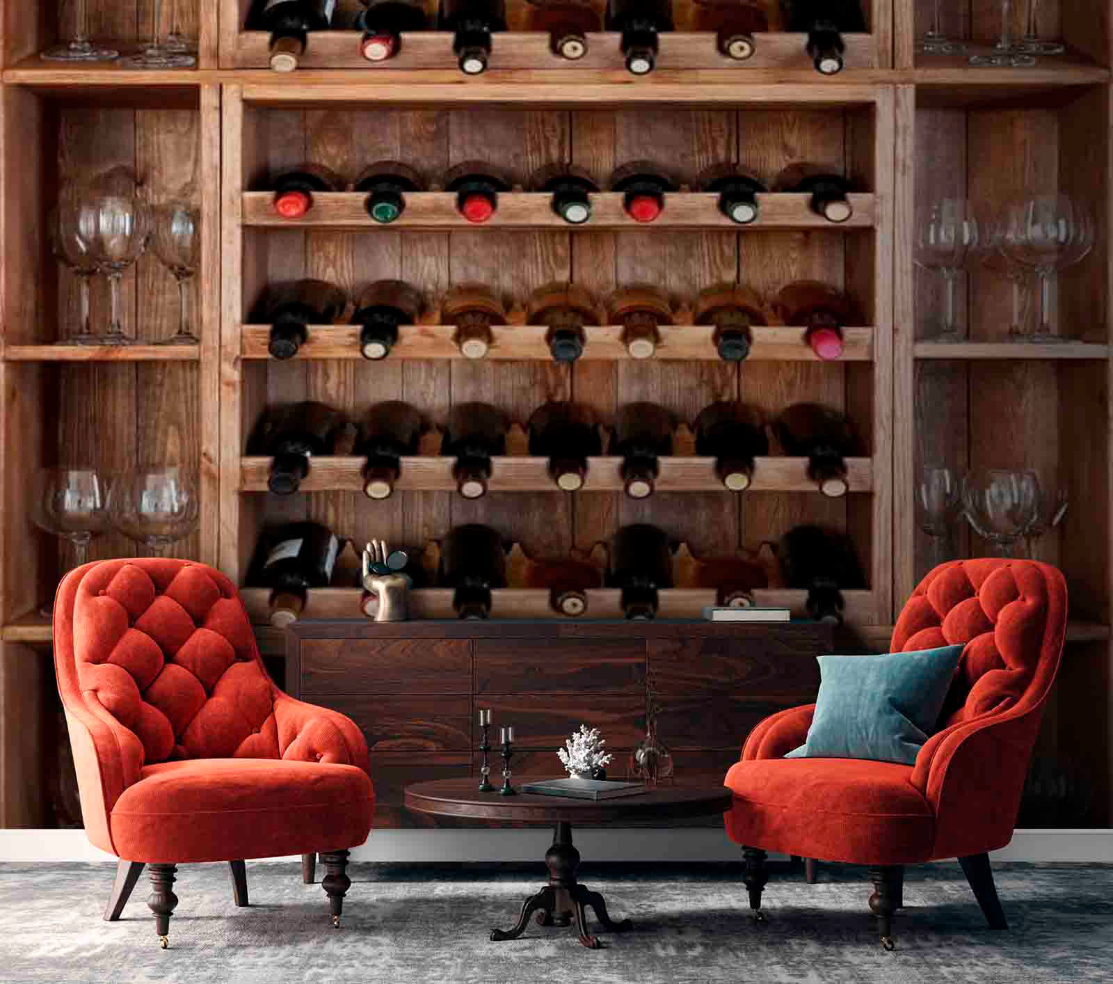 Transform your space with this charming wall mural featuring a delightful display of wine bottles and glasses on rustic shelves. It’s like having a cozy wine cellar right in your home, minus the need for corkscrews and spills. Imagine standing in front of it, feeling the warmth of the wood and the inviting hues of the bottles. Perfect for a kitchen, dining area, or even a home bar, this mural sparks conversations and sets the mood for gatherings. Just picture it—friends toasting, laughter filling the air, and that perfect bottle calling your name. Add a splash of character to your walls and let this mural bring a taste of fun and sophistication to your everyday life. Cheers to that!