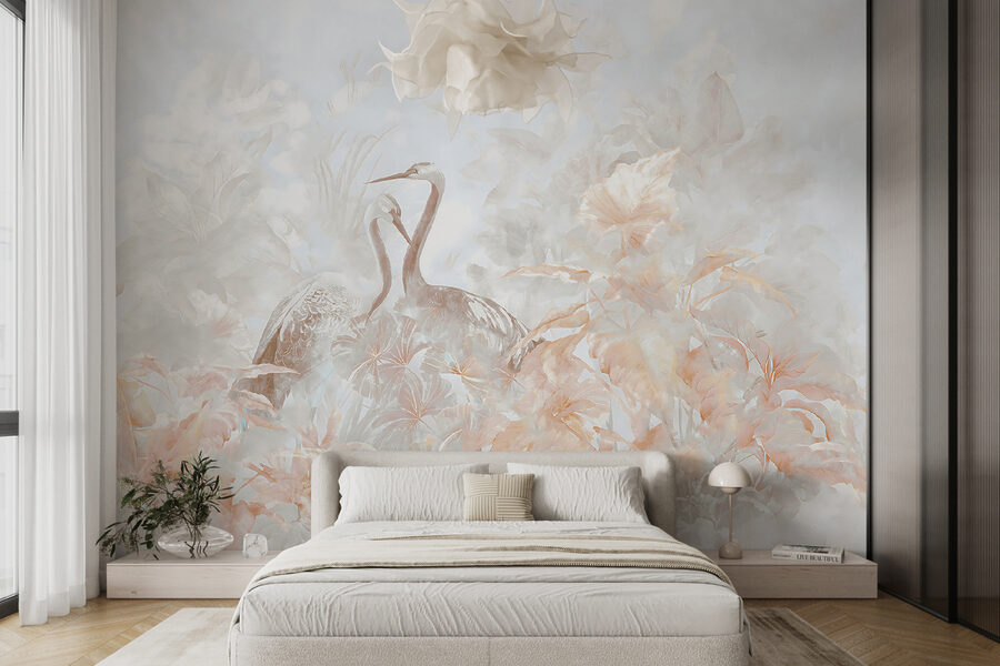Transform any room into a serene escape with this enchanting wall mural, “Cranes Amidst Lush Foliage.” Imagine stepping inside to find these elegant birds nestled among vibrant greenery, inviting a touch of nature right into your home. The soft hues blend beautifully, creating a calming atmosphere—perfect for unwinding after a long day.