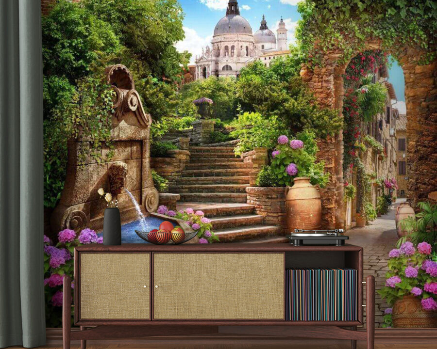 Transform any room into a charming escape with this mural featuring a lovely stone path. It draws you in with a gentle fountain, inviting you to pause and reflect. Imagine catching a glimpse of this every morning—flowers blooming, sunshine pouring in, and maybe even a few daydreams along the way. The steps lead somewhere magical, sparking a little wanderlust right in your home. It’s perfect for those cozy nooks where coffee breaks and chats happen, creating an atmosphere that feels both warm and a tad adventurous. A delightful addition for anyone with an eye for unique decor.