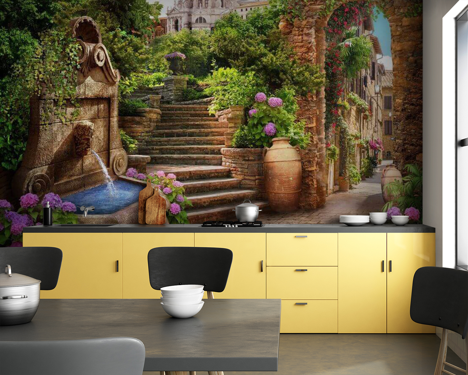 Transform any room into a charming escape with this mural featuring a lovely stone path. It draws you in with a gentle fountain, inviting you to pause and reflect. Imagine catching a glimpse of this every morning—flowers blooming, sunshine pouring in, and maybe even a few daydreams along the way. The steps lead somewhere magical, sparking a little wanderlust right in your home. It’s perfect for those cozy nooks where coffee breaks and chats happen, creating an atmosphere that feels both warm and a tad adventurous. A delightful addition for anyone with an eye for unique decor.