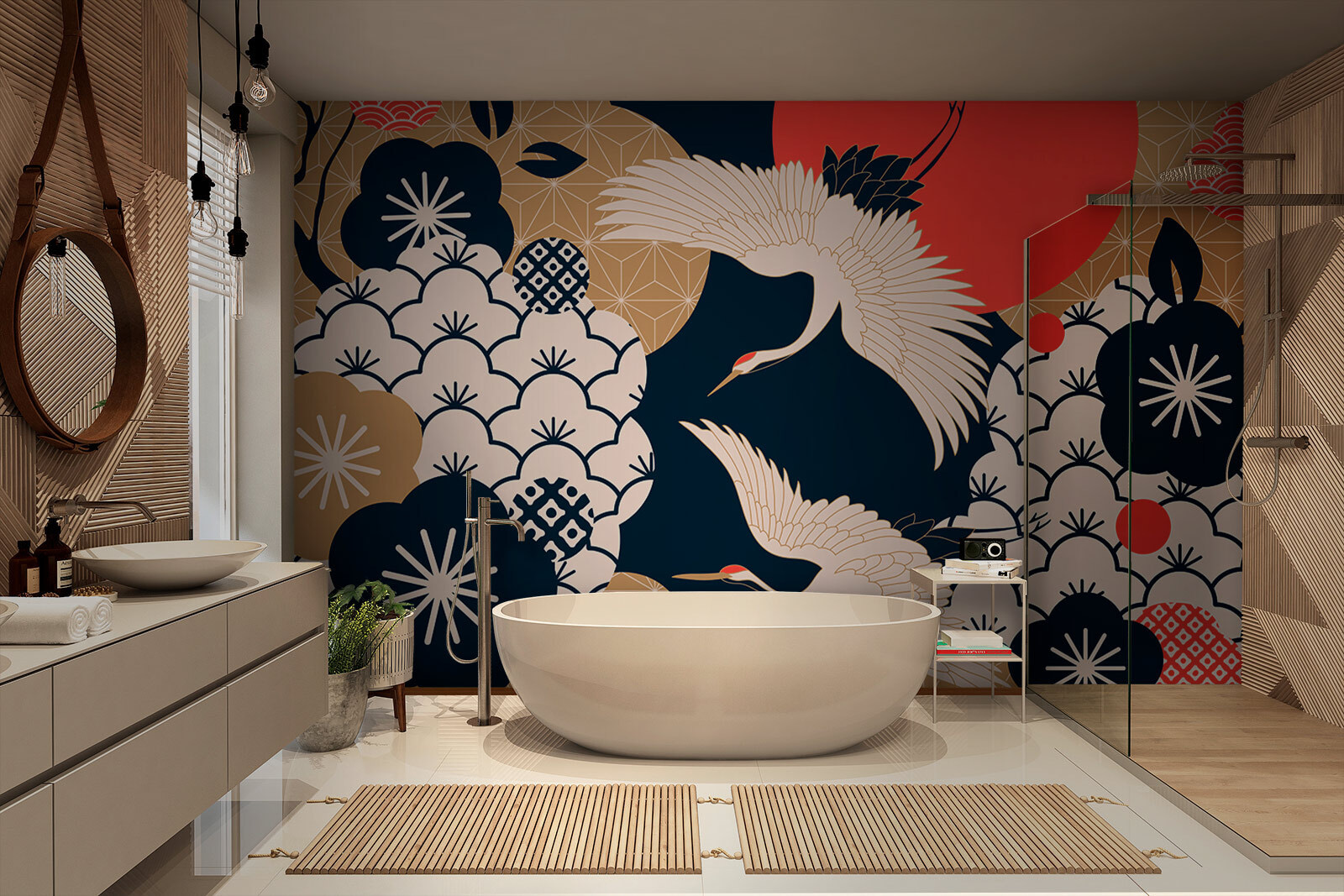 Transform your space with the “Cranes Soar Above Decorative Blossoms” mural. Imagine stepping into a world where elegant cranes glide over vibrant blossoms, bringing a touch of nature right into your home. This design isn’t just a wallpaper; it’s a conversation starter, a story waiting to unfold on your walls.