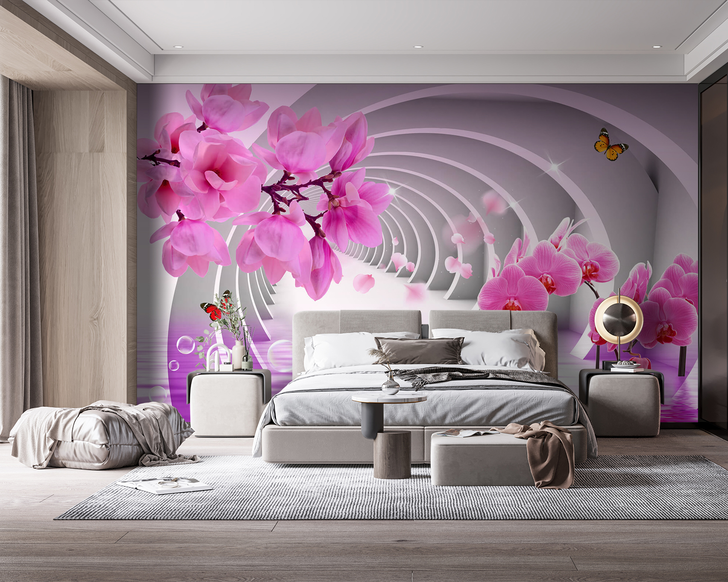 Transform your space with this stunning wall mural that features vibrant butterflies fluttering among luscious pink orchids. It’s like bringing a bit of nature indoors—minus the whole “getting dirt under your nails” part. Imagine stepping into your room and feeling that rush of calm, as if you’re wandering through a serene garden. Those striking black and red wings don’t just stand out; they dance against the subtle tones, creating a visual delight. Perfect for a cozy nook or a lively living area, this mural adds depth and charm, making every glance a little more enchanting.