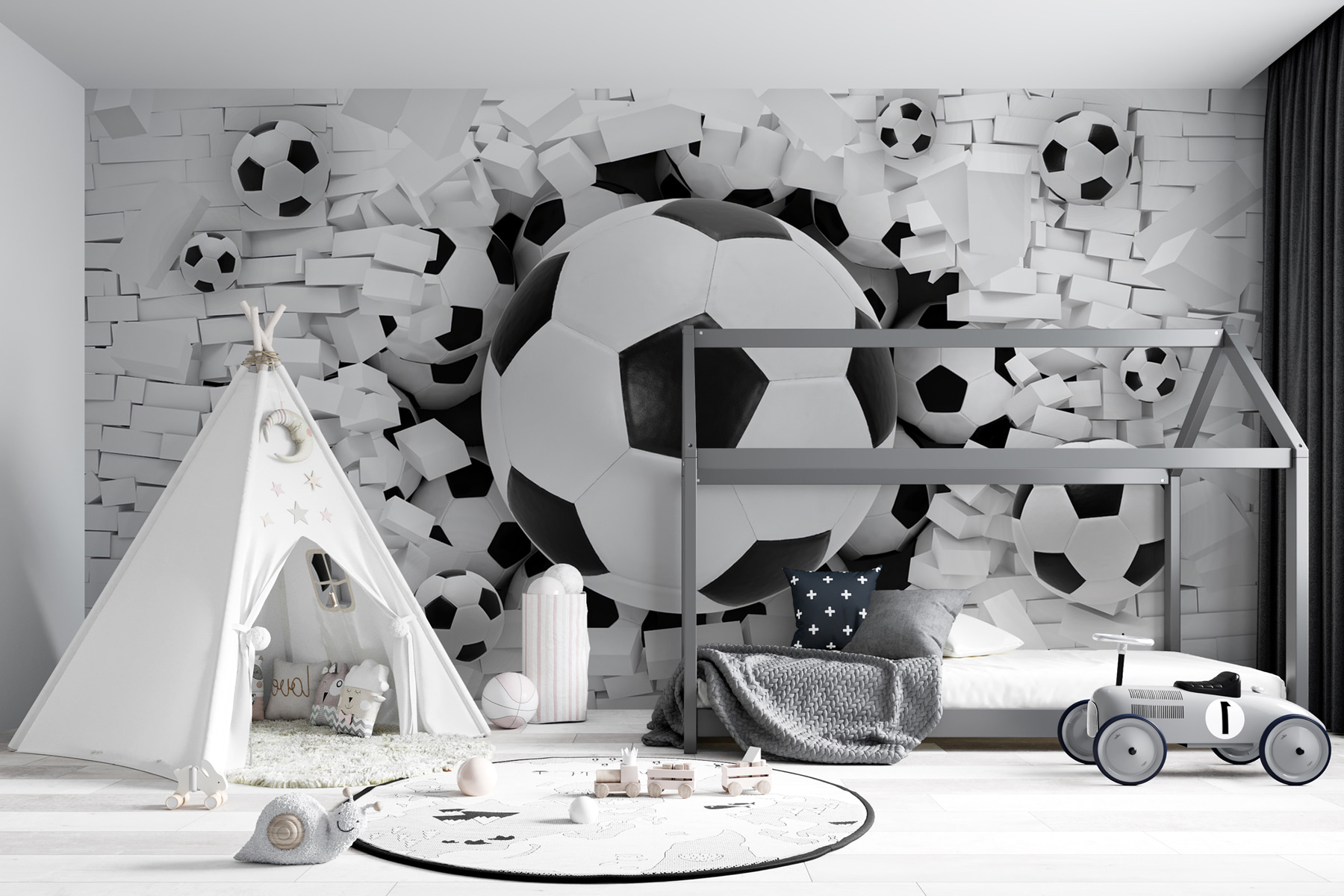 Transform any space into a vibrant playground with this eye-catching “Soccer Balls Burst Through the Wall” mural. Imagine stepping into a room where soccer dreams leap off the walls! It’s like the world’s biggest goal celebration right in your living room. Perfect for kids or the young-at-heart, this mural adds a dash of excitement and energy. Picture little ones racing in, eyes wide, as if they’re dodging actual soccer balls. Seriously, it’s a fun way to spark creativity and imagination—because who wouldn’t want to feel that rush of play every day? Plus, that 3D effect? It’s all about making a statement without saying a word. Bring on the cheers and let the good times roll!