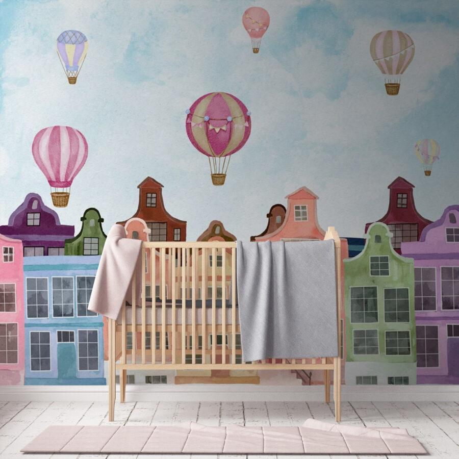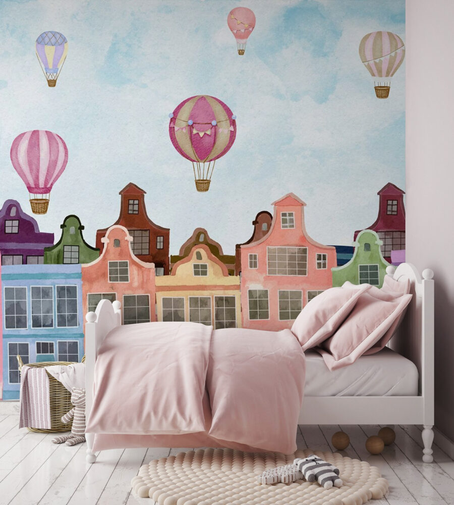Every glance at this mural might just take you on a mini escape. Picture sipping your coffee while these vibrant buildings cheerfully gaze back at you, making mundane mornings feel special. Or, imagine how this beauty could inspire storytelling during family gatherings—everyone’s got their own balloon adventure. With its charming mix of colors, this mural will effortlessly lift your spirits like those hot air balloons floating on a sunny day. Perfect for a cozy nook, or that one wall that’s been feeling a bit lonely, it’s not just decor—it’s an experience waiting to happen.