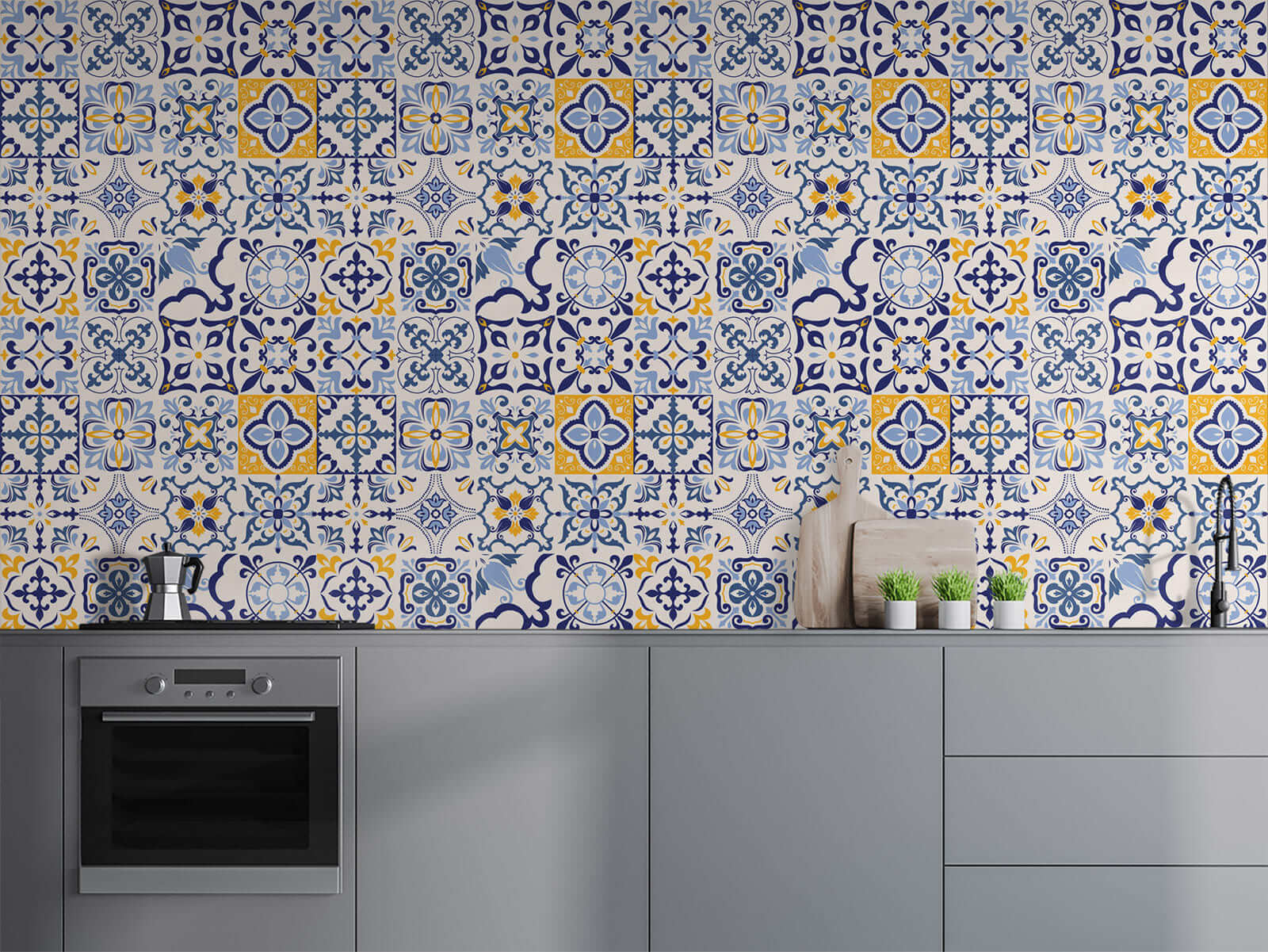 Transform your space with this vibrant wall mural featuring a stunning pattern of blue and yellow tiles. It’s like bringing a bit of Mediterranean charm right into your home. Picture stepping back into a cozy café in Spain, sipping coffee while soaking in the beautiful designs all around you. The geometric shapes dance across your wall, adding a playful touch that sparks joy every time you walk by. It’s perfect for brightening up a dull room or creating a lively backdrop for your next gathering. Imagine friends admiring your taste while you secretly bask in the glory of your fabulous decor choice. Why stick to boring walls when you can have a piece of art that feels alive?