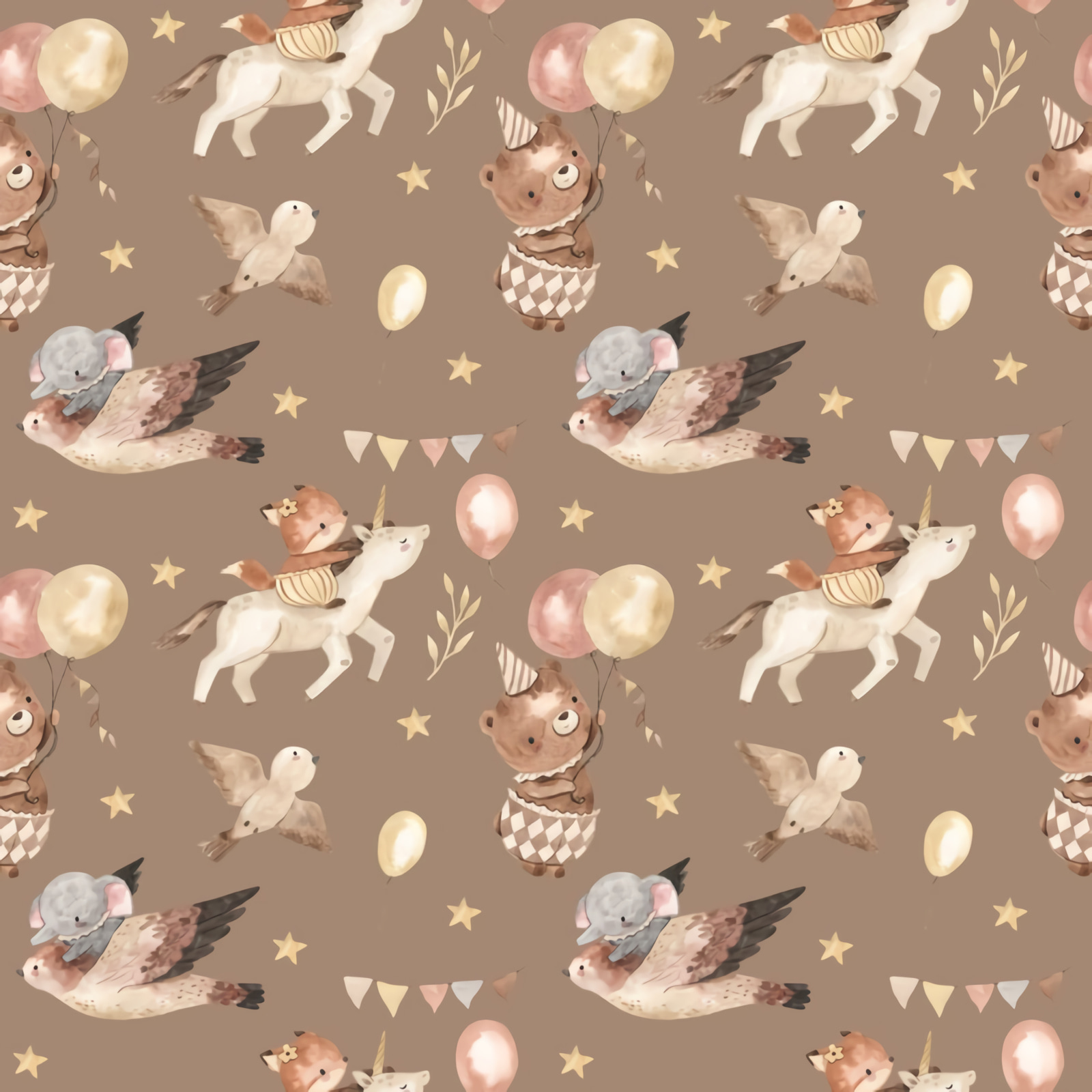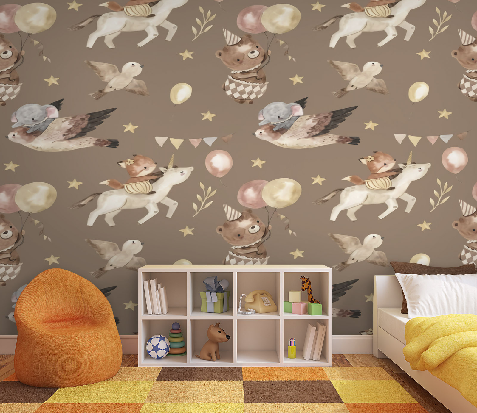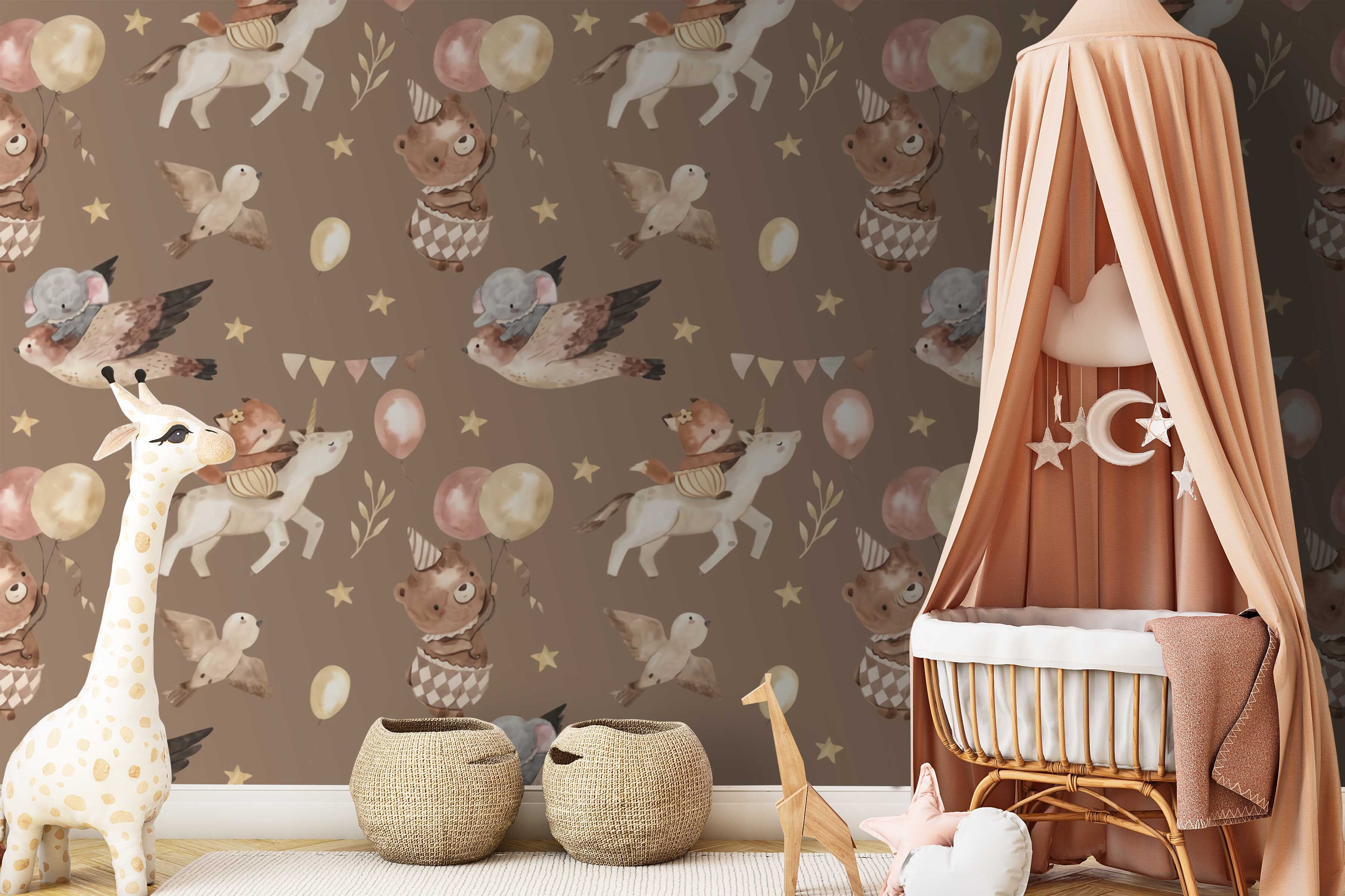 Transform any space into a whimsical wonderland with this delightful wall mural, showcasing a parade of adorable animals soaring through the sky with bright balloons. Picture this: a little bear, dressed like a party pro, is holding onto a balloon while a cheeky fox rides a unicorn. It’s a playful scene that invites smiles and ignites imagination, perfect for kids or anyone young at heart. Imagine waking up to this cheerful vibe every day—who wouldn’t feel a bit lighter? It’s like a happy little escape right on your walls, sparking joy and maybe even some fun conversations about adventures through the clouds. Perfect for creating an inviting playroom or adding character to a cozy nook!