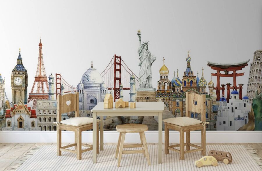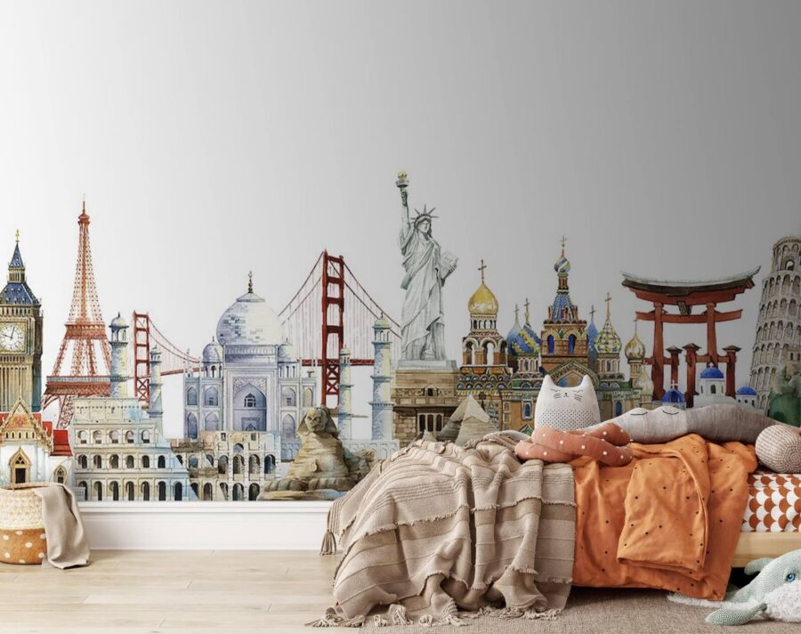Bring the world to your walls with this stunning watercolor mural featuring iconic landmarks from across the globe. Imagine waking up to the Eiffel Tower on one side and the Great Wall of China on the other—it’s like having a mini vacation every day. The soft hues create a dreamy atmosphere, making any space feel lively yet calming. Whether it’s for a cozy living room or a vibrant office, this mural’s charm brings a splash of creativity that sparks conversations. Plus, who doesn’t love a bit of wanderlust right at home? It’s an everyday reminder that adventure is just around the corner. Perfect for those who daydream of travels yet love to nest!