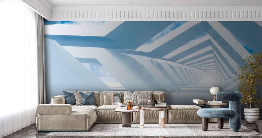 Step into a world where the sky meets modern design with this captivating wall mural. Imagine your space being transformed into a fresh, airy retreat, bright and open. The stunning play of white structures against a backdrop of fluffy clouds and vibrant blue skies creates an illusion of endless space—a perfect escape from the everyday hustle.
