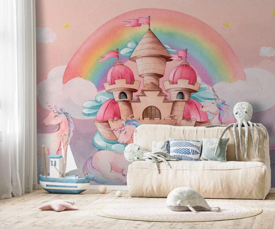 Welcome to a magical escape! This enchanting wall mural features whimsical unicorns prancing around a dreamy castle beneath a vibrant rainbow. Perfect for little ones who dream of adventures and fairy tales, this mural transforms a plain wall into an extraordinary canvas of imagination. Just picture it—kids might giggle with delight, wide-eyed, as they spot new treasures in the scene every day. It’s like a doorway to a fantasy realm, inviting everyone to get lost in stories of magic and friendship. Ideal for playrooms or nurseries, it adds a sprinkle of joy and warmth, making any space feel like home. Who wouldn’t love a little bit of unicorn magic in their lives?