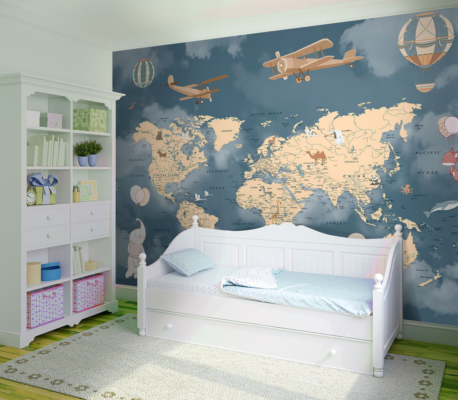 Transforming a child’s room with the “Hot Air Balloon in the Sky” mural is like inviting a fun little adventure right onto the walls. Picture this: a whimsical world filled with adorable animals soaring high, riding along with charming hot air balloons. It’s not just a mural—it’s a gateway to imagination. Kids might find themselves dreaming of flights across the globe, exploring new lands with a monkey or a friendly elephant by their side. And let’s be real, who wouldn’t want their morning cereal routine to feel like a journey? Colors are soft yet vibrant, sparking creativity without overwhelming the senses. A beautiful reminder to take a flight of fancy, as they drift off to sleep under the magic of the skies! Perfect for bedtime stories and daydream-filled afternoons.