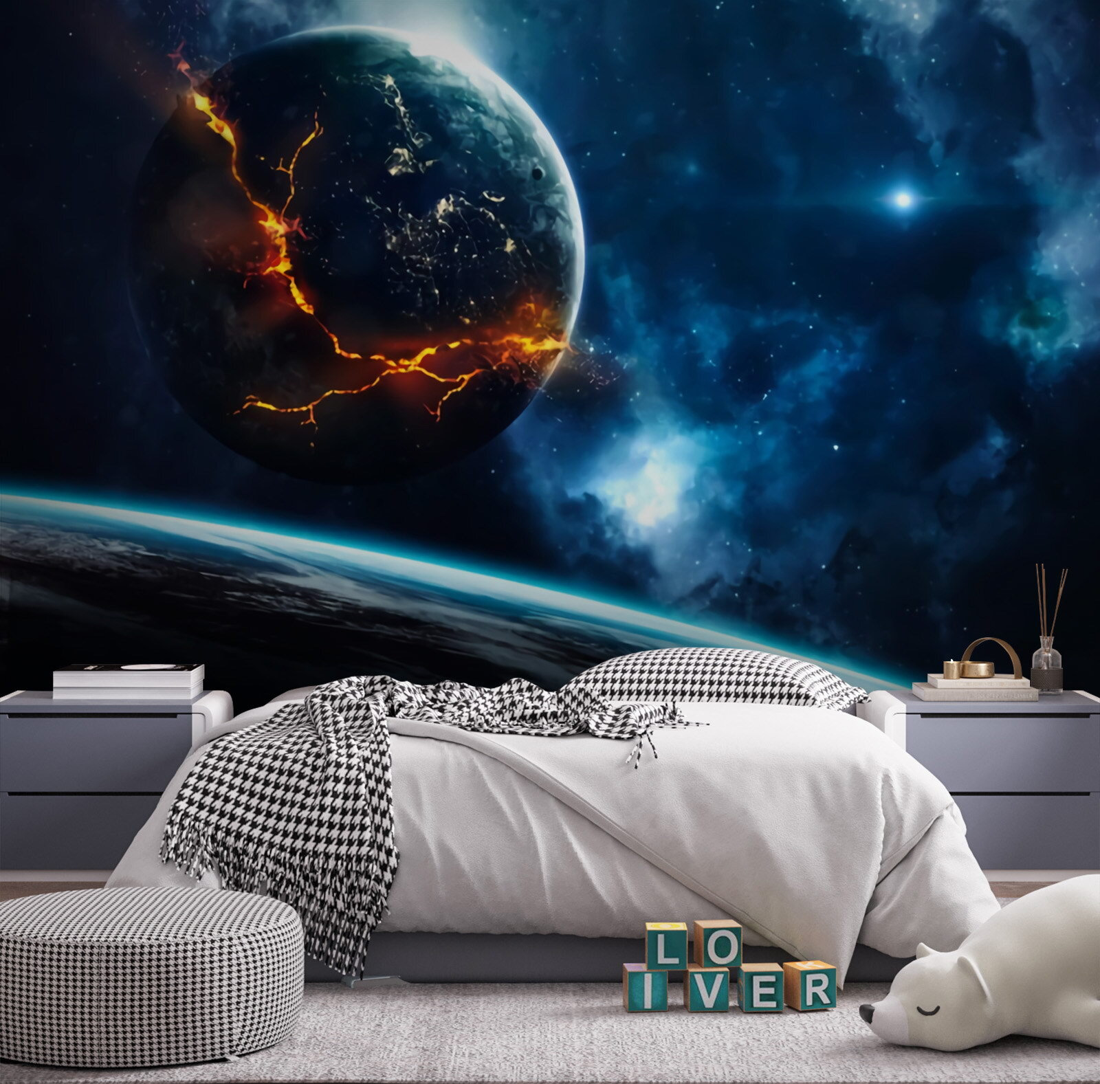 Transform your space with this stunning wall mural, “Wall Murals Planet with a Fire in the Background.” Imagine the thrill of gazing up at a distant world, with fiery cracks illuminating the darkness of space—it’s like creating your own cosmic escape right at home. This piece isn’t just wallpaper; it sparks conversations and invites imaginations to wander. Picture relaxing in your favorite chair, sipping coffee, and getting lost in the galaxy. Perfect for a home office or a creative nook, it brings a dash of drama and wonder. Who wouldn’t want to feel like they’re floating among the stars?
