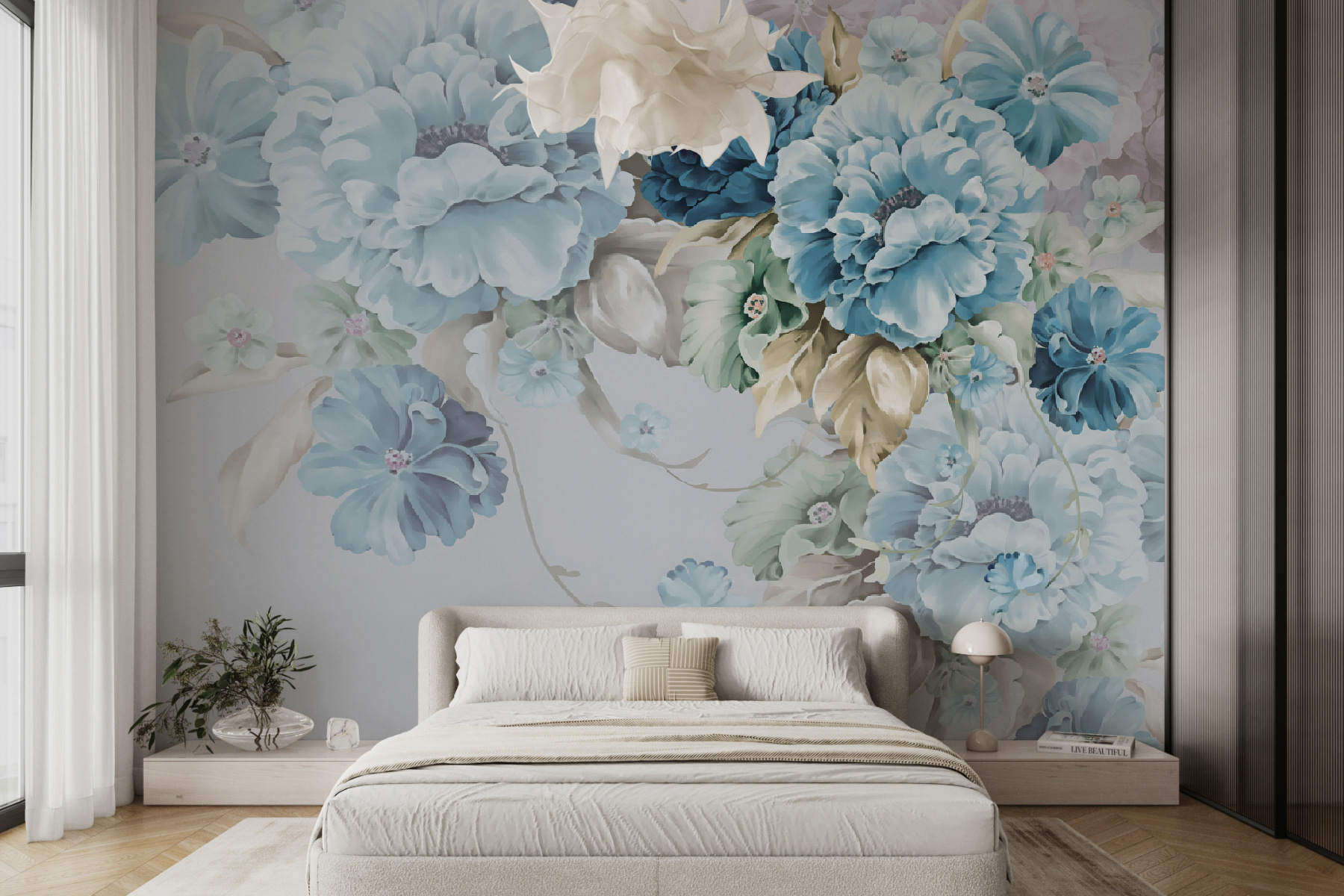 Transform any space with the enchanting Wall Mural “Pastel Blossoms in Artistic Arrangement.” Imagine stepping into a garden bursting with colors—blues, greens, and soft pastels that bring comfort and joy. Perfect for a cozy reading nook or an inviting living room, this mural speaks the language of flowers without the watering can.
