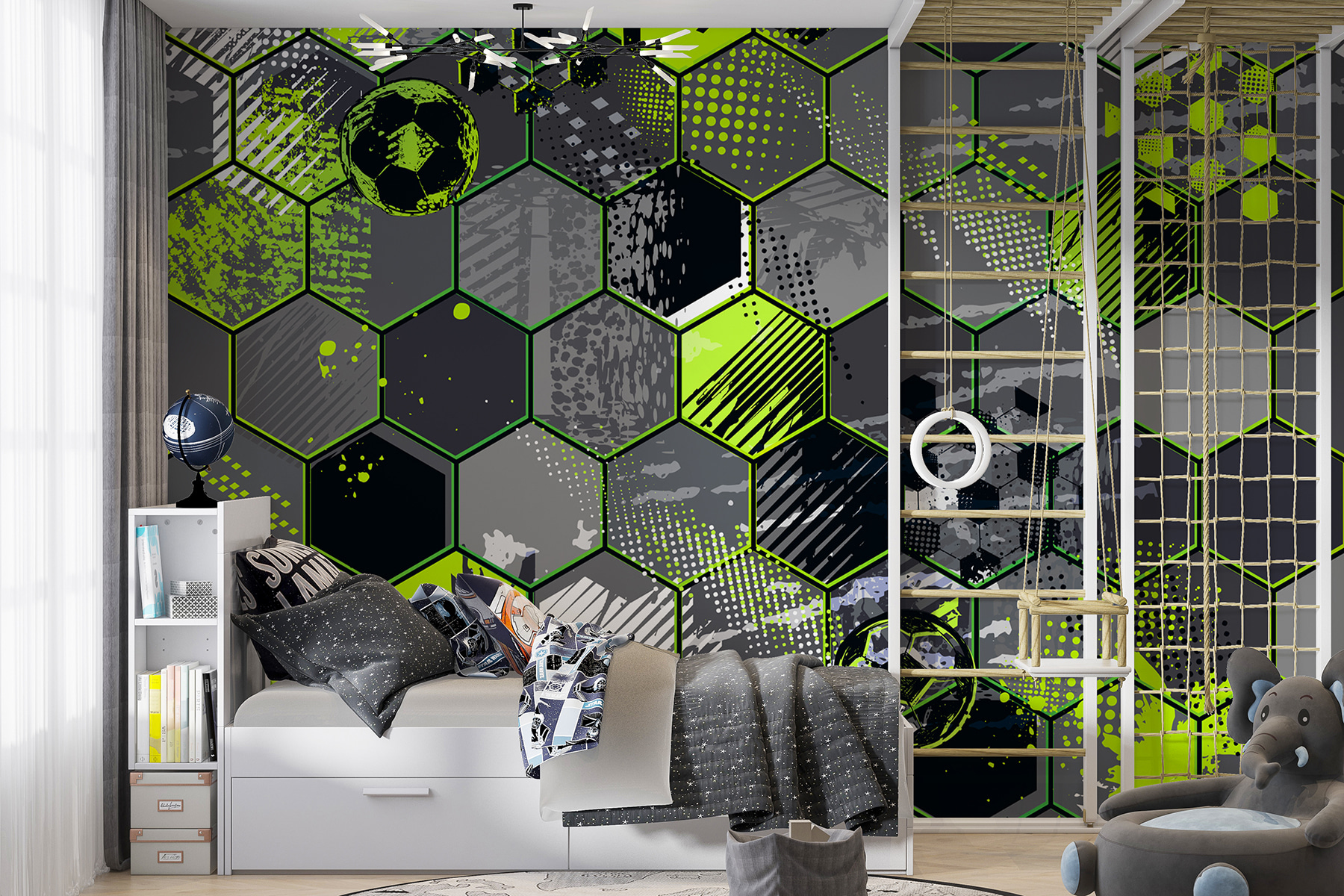 Transform any wall into a stunning focal point with this vibrant geometric mural. Bursting with eye-catching hexagons in bold greens and grays, it’s like a playful soccer strategy map—without the stress of penalties! Imagine sitting in your living room, sipping coffee, and being inspired by the energy of the design. Perfect for kids’ rooms, play areas, or even an office to keep things lively. It brings a dash of modern charm that’ll spark conversation. Who wouldn’t want a little flair that says, “Yeah, I’ve got style and a playful side!”?