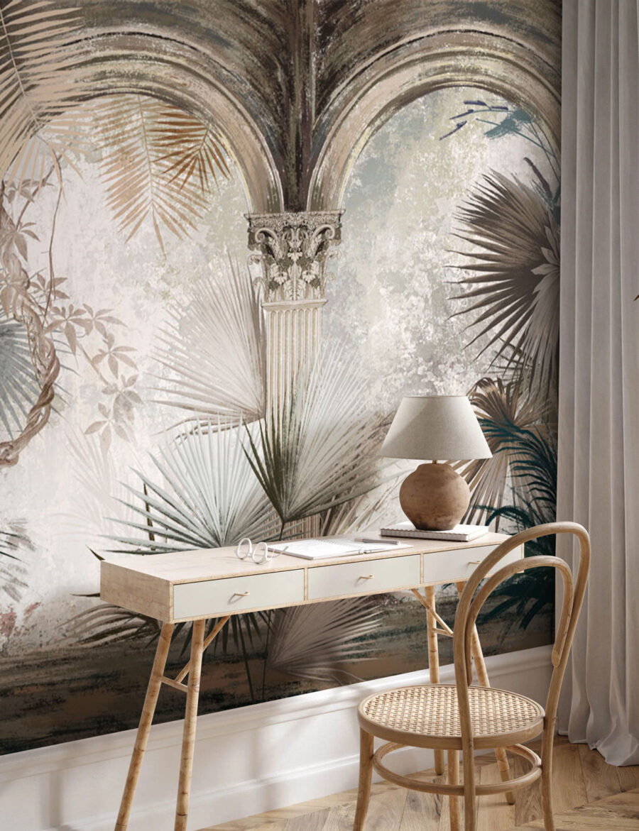 Step into a dreamy getaway with this enchanting mural, “Ancient Columns Amidst Lush Greenery.” Imagine your wall transforming into a serene escape, where history meets the wild charm of nature. Those majestic columns frame a tropical paradise, making it feel like you’re peeking into a forgotten garden. The soft hues and meandering leaves whisper tranquility, perfect for creating a cozy reading nook or a calming living space. It’s like having the outdoors inside, but without the bugs—bonus! So, grab a cup of tea, sink into your chair, and let your mind wander to sun-drenched afternoons among the vines. Your walls are ready for an adventure!