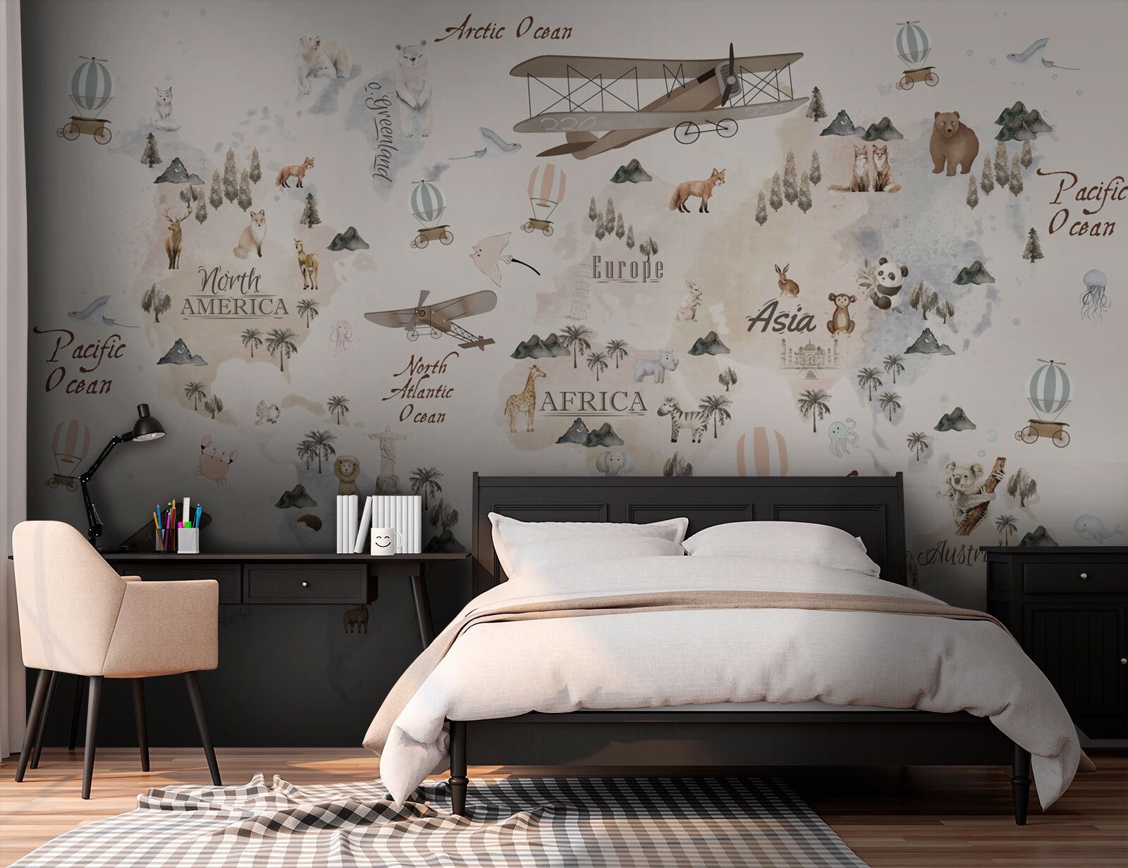 Transform any room into a whimsical adventure zone with this charming vintage map mural featuring delightful animals and vintage aircraft. Picture it: a cozy reading nook or a kid’s playroom where explorers of all ages can dream about far-off lands while snuggling up with a favorite book. The soft, muted colors create a serene backdrop, sparking imagination without overwhelming. Imagine a child’s giggle at spotting a sneaky panda or a proud lion. It’s like having a world tour right on the wall, inviting laughter and curiosity. Perfect for young wanderers at heart!