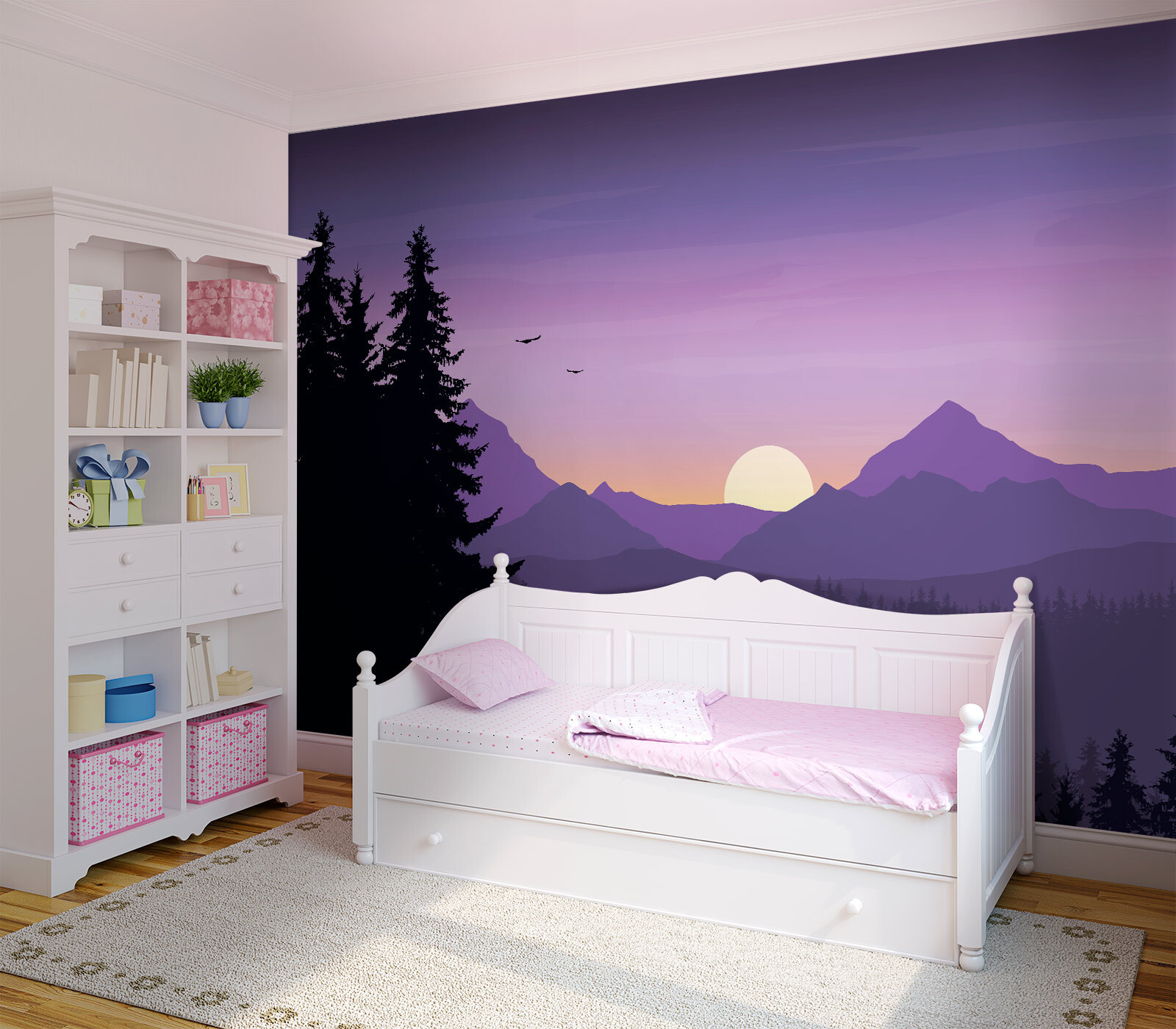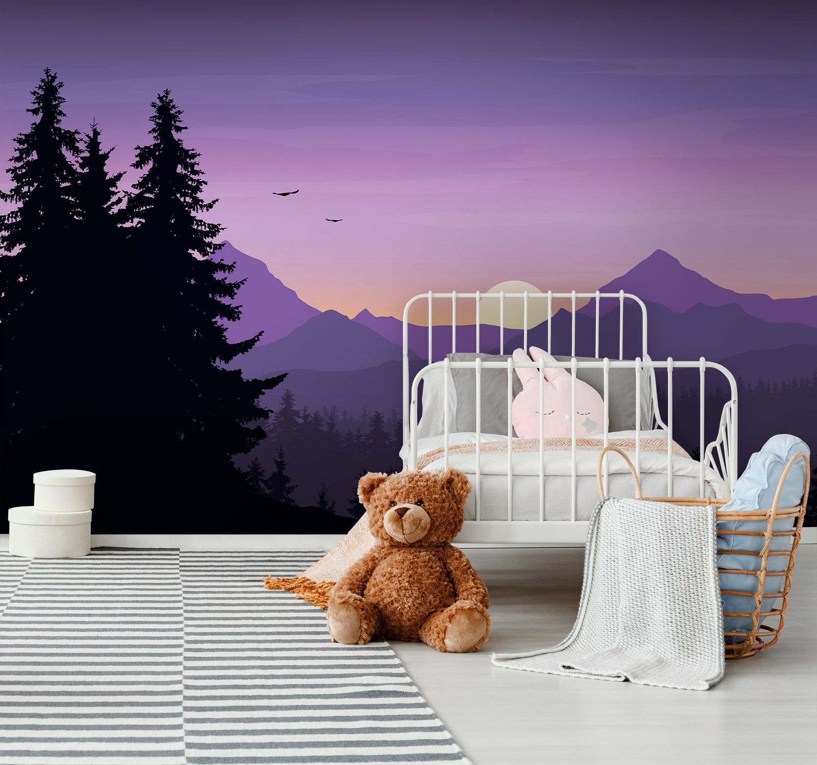 Imagine stepping into a cozy retreat, surrounded by the serene beauty of nature—without ever leaving your home. This wall mural, featuring a stunning landscape of trees and mountains, brings that dream right to your walls. Soft hues of purple dance across the sky as the sun sets, casting an enchanting glow. It’s like your own peaceful getaway, where stress just melts away. Picture curling up with a good book or sharing stories with friends, all while basking in this tranquil view. Each glance at those majestic mountains and tall trees might just inspire a little adventure—or at least some daydreaming about it. Perfect for nature lovers and those looking to add a touch of calm to their space. Why not let your walls do the talking? After all, who wouldn’t want a bit of the great outdoors indoors?
