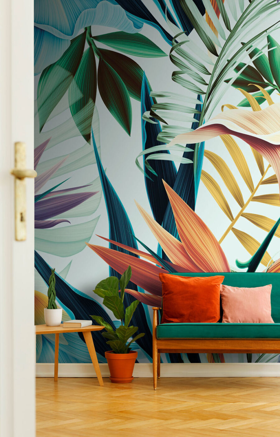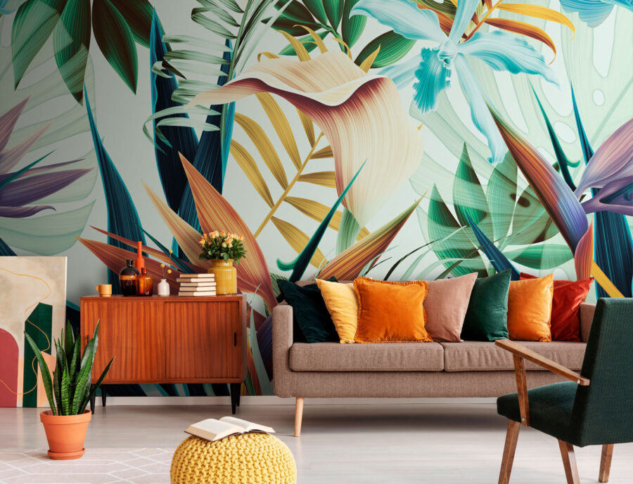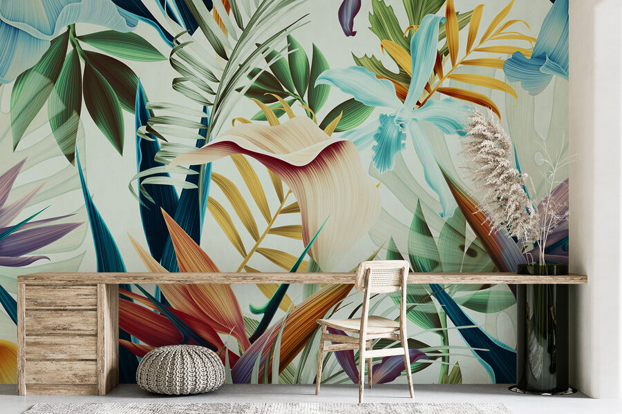 Transform your space with this stunning mural, “Colorful Abstract Leaves and Flowers.” It’s like bringing a tropical paradise right into your living room—don’t be surprised if you start hearing the sound of waves! The vibrant bursts of color and intricate patterns dance across the wall, giving off a serene vibe that whispers, “stay a while.” Picture a cozy reading nook where you can sip your coffee, surrounded by this lush backdrop. It’s not just wallpaper; it’s an experience, a conversation starter, even a mood booster. Who knew leaves and flowers could feel so enchanting?