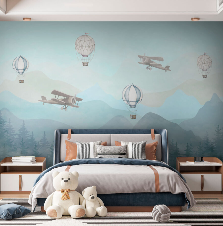 Transform any child’s room into a dreamy escape with this enchanting mural featuring planes and hot air balloons drifting over misty mountains. Imagine that delightful moment when little eyes catch a glimpse of this whimsical art, transporting them straight into a world of adventure. The soft colors create a calming atmosphere, perfect for bedtime stories and sweet dreams. It’s like inviting a gentle breeze and a sprinkle of magic right onto the walls. Plus, who wouldn’t want to wake up each day feeling like they could soar through the skies? It’s not just decor; it’s an experience for imaginations to take flight!