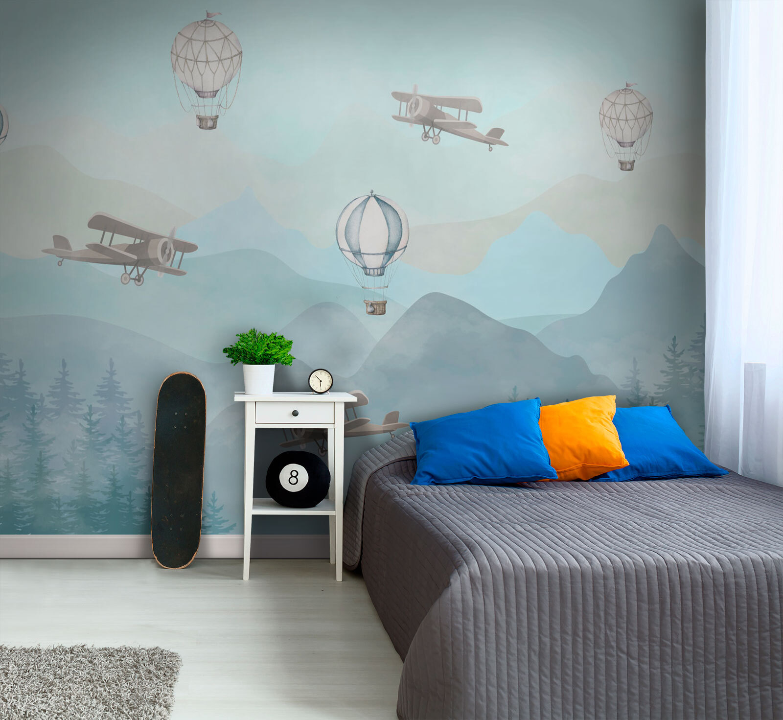 Transform any child’s room into a dreamy escape with this enchanting mural featuring planes and hot air balloons drifting over misty mountains. Imagine that delightful moment when little eyes catch a glimpse of this whimsical art, transporting them straight into a world of adventure. The soft colors create a calming atmosphere, perfect for bedtime stories and sweet dreams. It’s like inviting a gentle breeze and a sprinkle of magic right onto the walls. Plus, who wouldn’t want to wake up each day feeling like they could soar through the skies? It’s not just decor; it’s an experience for imaginations to take flight!