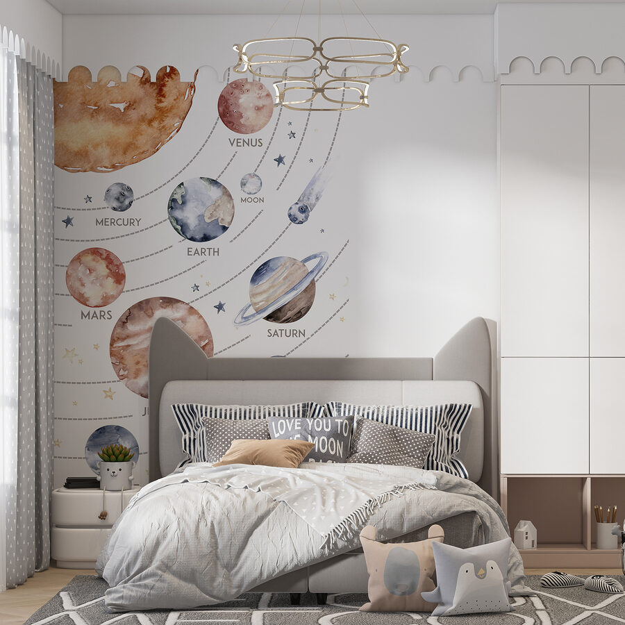 Transform any space into a cosmic wonderland with this enchanting watercolor mural! Imagine kids gazing up in awe at planets swirling around them, igniting their imaginations and sparking dreams of space adventures. The gentle hues and delicate brushstrokes create a dreamy atmosphere—perfect for playrooms, nurseries, or even a cozy reading nook. Picture storytime under the vastness of the universe, where each planet tells its own tale. It’s not just decor; it’s an invitation to explore the galaxy right from home—without the need for a spaceship!