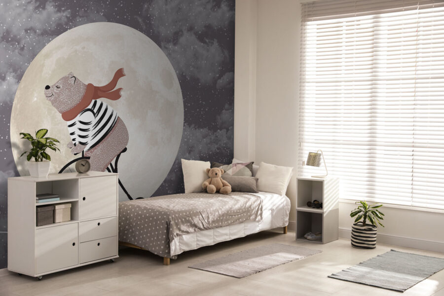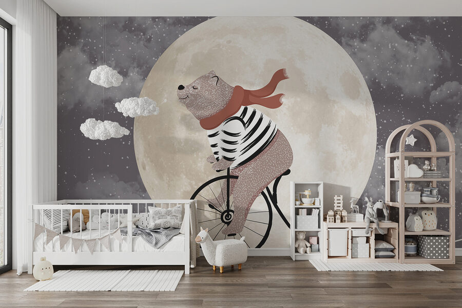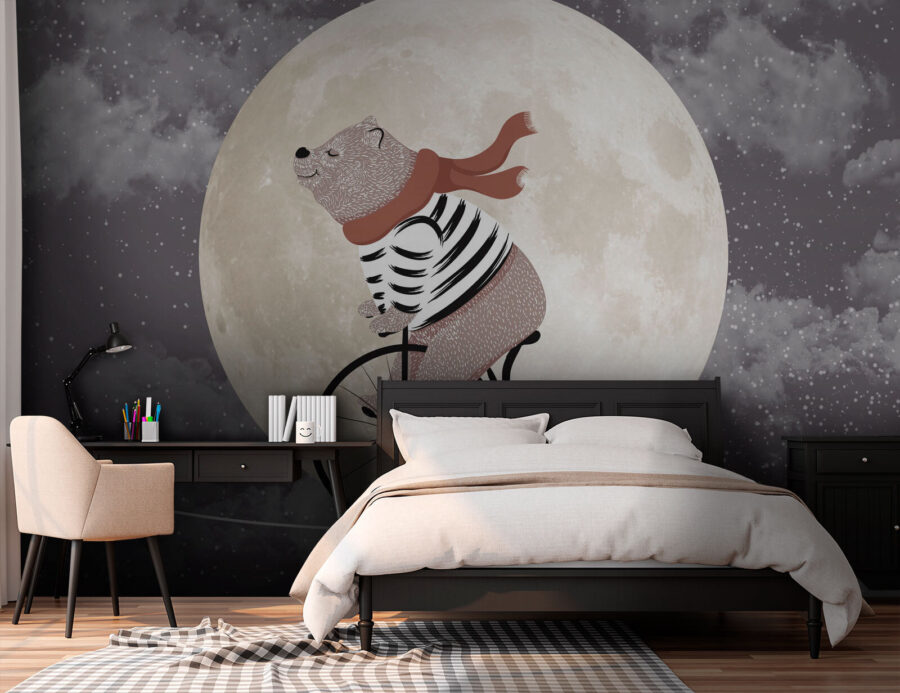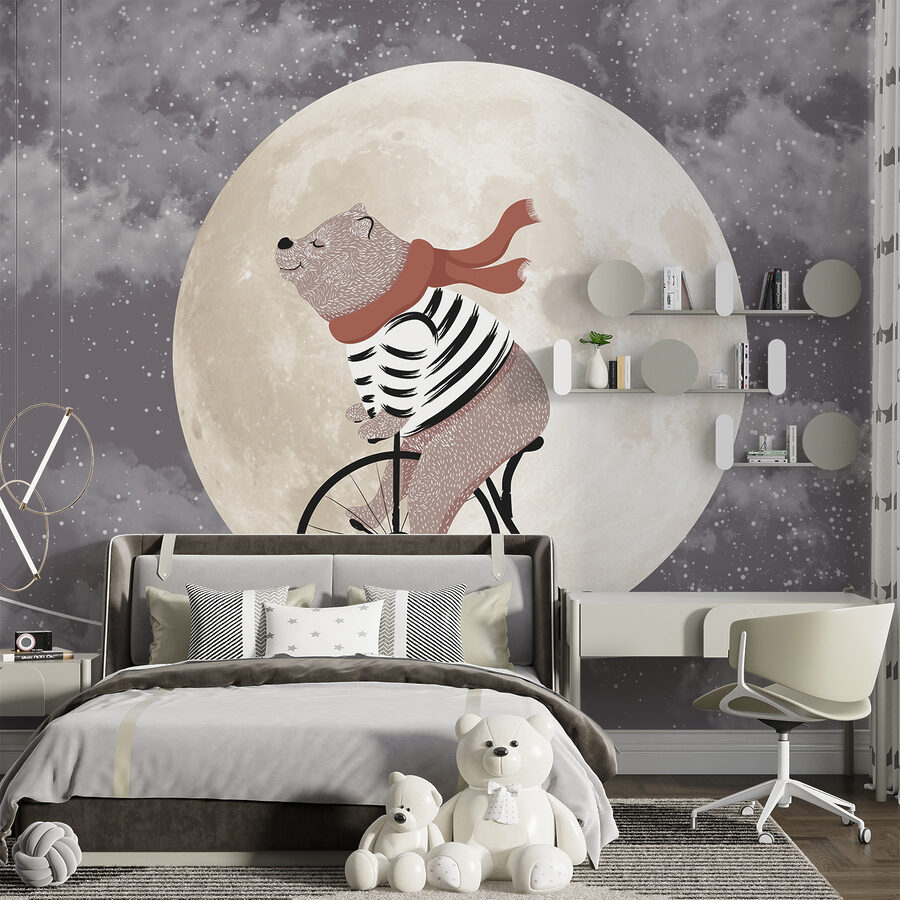 Imagine a whimsical scene where a bear, dressed in stripes and a cozy scarf, takes a leisurely bike ride across a glowing moon. This charming mural isn’t just a piece of art; it’s a ticket to a dreamy adventure that transforms any wall into a fun escape. Kids’ rooms will feel extra magical, sparking imagination and countless stories about the bear’s nighttime escapades. Who wouldn’t smile seeing that furry friend cruising through the clouds? It’s like a hug for the space—soft, cozy, and just a tad silly. Add this mural, and watch the room come alive, inspiring little dreamers every night. Plus, it’s a great reminder that sometimes, you just gotta take it easy and pedal through the stars! Perfect for those who crave unique decor that radiates joy and whimsy.