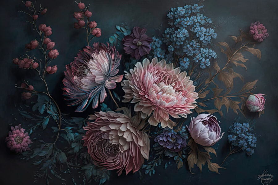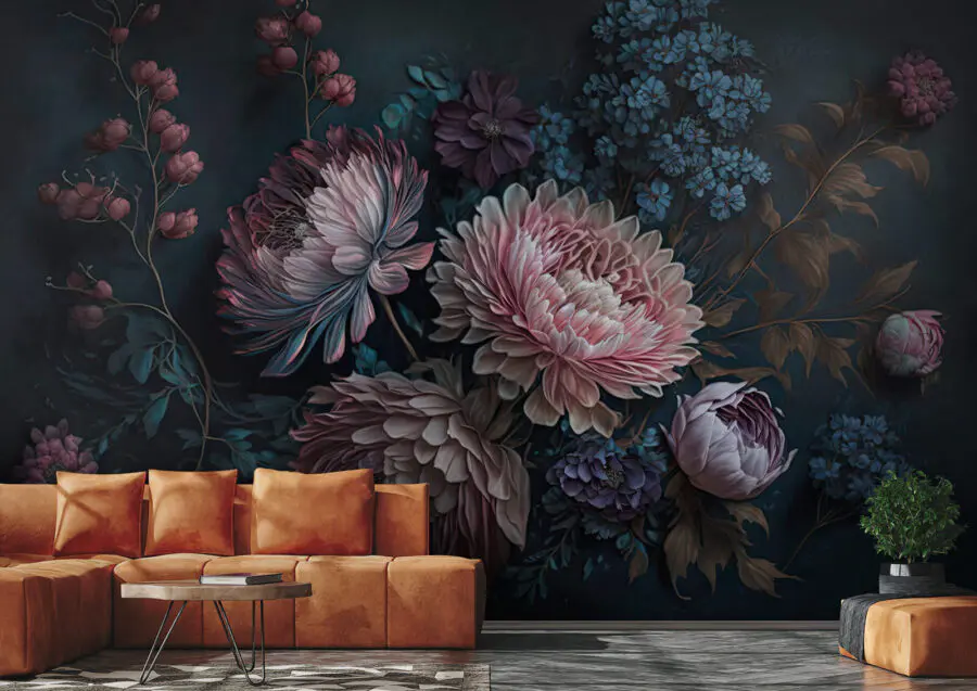 Transform any space with this stunning wall mural featuring a vibrant floral arrangement in deep, rich hues. Imagine stepping into a room where elegant blooms dance across your walls, bringing a touch of nature’s charm right inside. The dark background lets each petal pop—it’s like having a garden that never wilts! Perfect for that empty wall or a cozy reading nook, this mural sparks joy and a hint of sophistication. Friends will wonder if you’ve got a secret garden hidden away. It’s not just a decoration; it’s an experience waiting to happen!