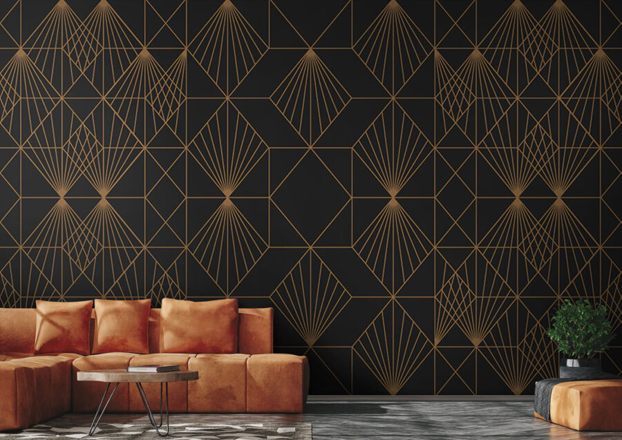 Transform any room into a stylish haven with this striking mural featuring an intricate geometric pattern on a deep black background. Just picture it—waking up to those sharp lines and playful shapes that seem to dance across the wall. It’s like having an art gallery right in your own space. The design adds a punch of life to a dull room, inviting curiosity from guests and sparking conversations. It’s both modern and mesmerizing, perfect for creating a cozy nook or an attention-grabbing feature wall. You won’t just see it; you’ll feel it too—like a warm embrace of creativity. Give your walls a personality lift; who wouldn’t want that?