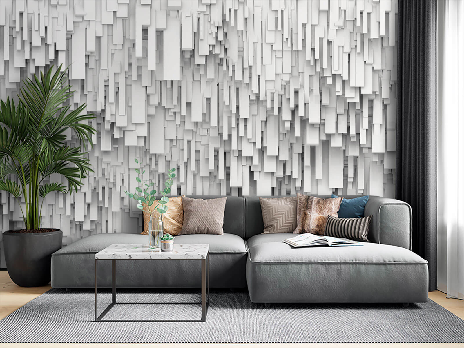 Transform your space with this eye-catching wall mural featuring a beautiful array of white rectangular shapes. It’s like a little piece of modern art splashed right onto your wall! Imagine walking into a room where the walls whisper tales of contemporary elegance. The play of light and shadows creates a calming atmosphere, perfect for cozy evenings or lively gatherings. It’s a tangle of geometric charm that feels so inviting, it might just beg for a cup of coffee and a leisurely chat. Perfect for those who appreciate the unique and want their decor to have a little personality!
