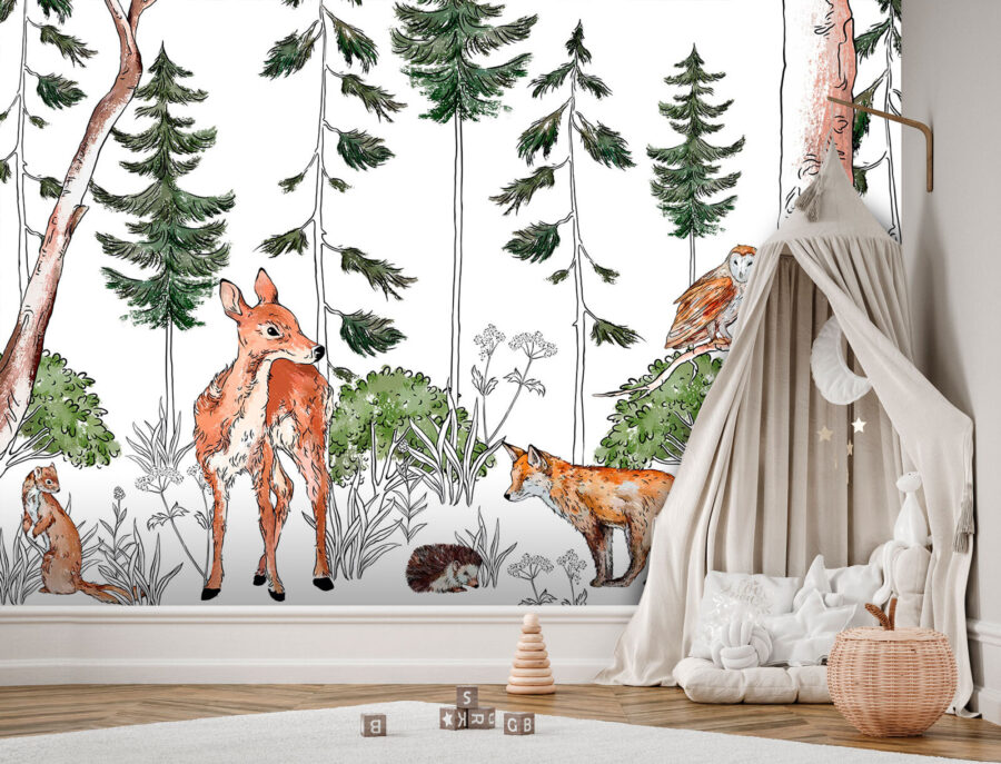 Transform any space with this charming wall mural featuring a delightful cast of woodland creatures! Imagine a serene forest scene, where a curious stag and a playful fox roam among lush greenery. An owl watches from above, adding a touch of whimsy. It’s like having a slice of nature right on your wall. Perfect for a cozy reading nook or a child’s room, this mural invites the outdoors in, making every glance a little adventure. Spread joy and warmth, and let storytelling unfold in your own enchanted forest—never a dull moment with these furry friends!