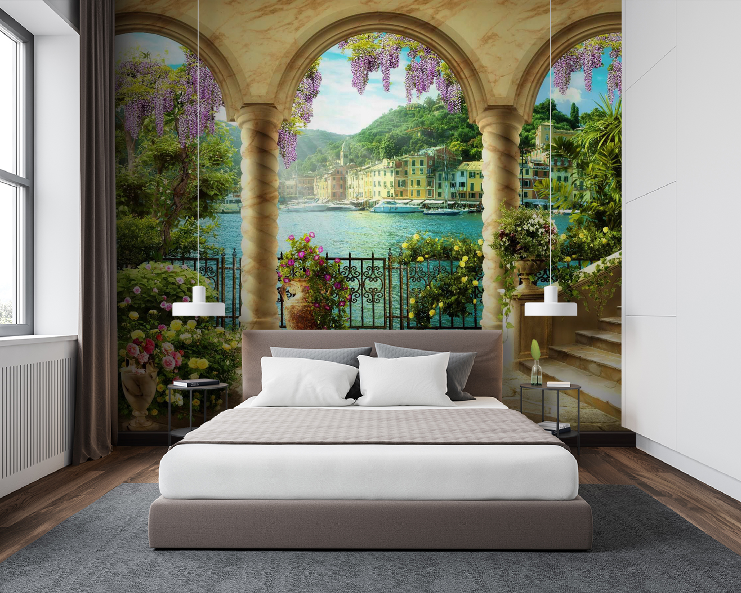 Transform your space with this vibrant wall mural, “Colorful Garden Overlooking the Harbor.” Imagine stepping into a sun-soaked Italian villa every time you walk into the room. Those blooming flowers, cheerful hues, and stunning water views could make anyone smile—even on the dreariest days. It’s like daily therapy, with a splash of whimsy!