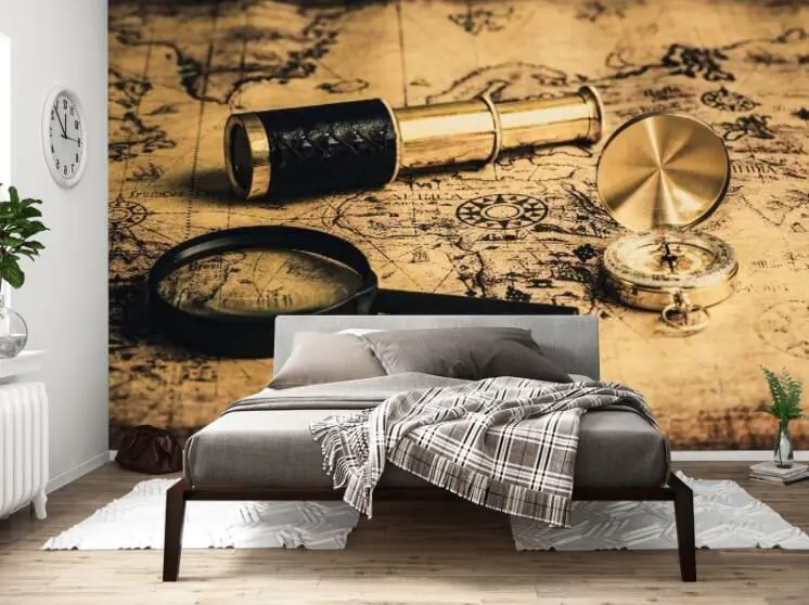 Transform your space into a cozy study of exploration with this stunning mural. Picture it: a beautifully aged map, complete with a magnifying glass and a telescope, ready to inspire your inner adventurer. It’s more than just decor—it’s an invitation to daydream. Just imagine sipping a cup of coffee while tracing routes to far-off places, or the stories you could share around the dinner table. The warm tones and detailed imagery bring a touch of history and curiosity to any room. Great for those who appreciate the art of wandering, even if it’s just in the mind!