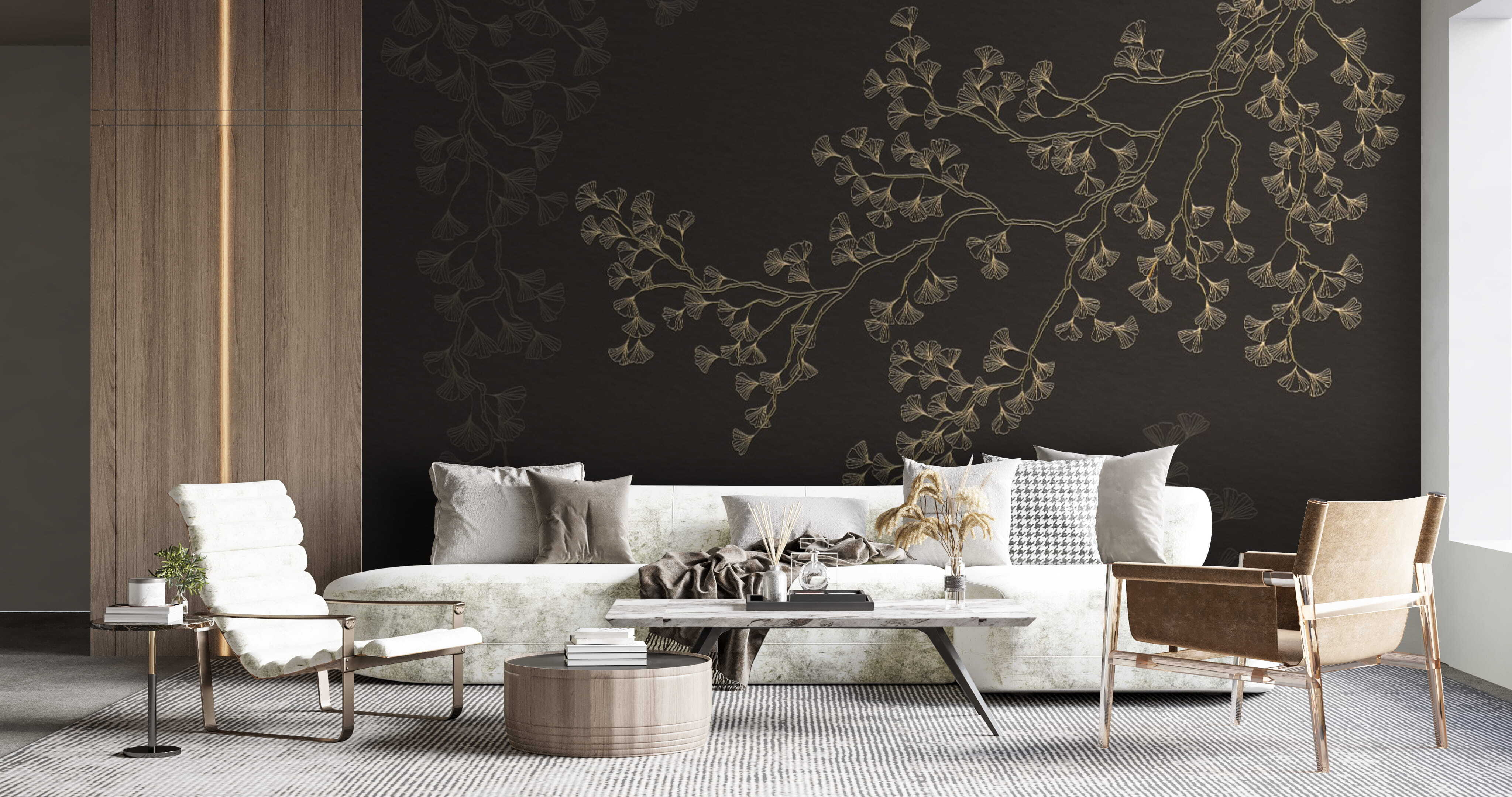 Transform your space with the charming allure of this wall mural featuring elegant ginkgo leaves against a deep, dark background. Just picture it: stepping into a room where those delicate, swirling branches dance effortlessly, bringing a slice of nature’s grace right indoors. The soft lines and contrasts create a cozy yet sophisticated feel, perfect for sipping tea on a rainy afternoon or having a heart-to-heart with a friend. With this mural, the walls become storytellers, inviting warmth and a hint of whimsy. A delightful way to breathe life into any corner, turning even an ordinary wall into a lush escape. How soon can you start imagining your favorite spot?